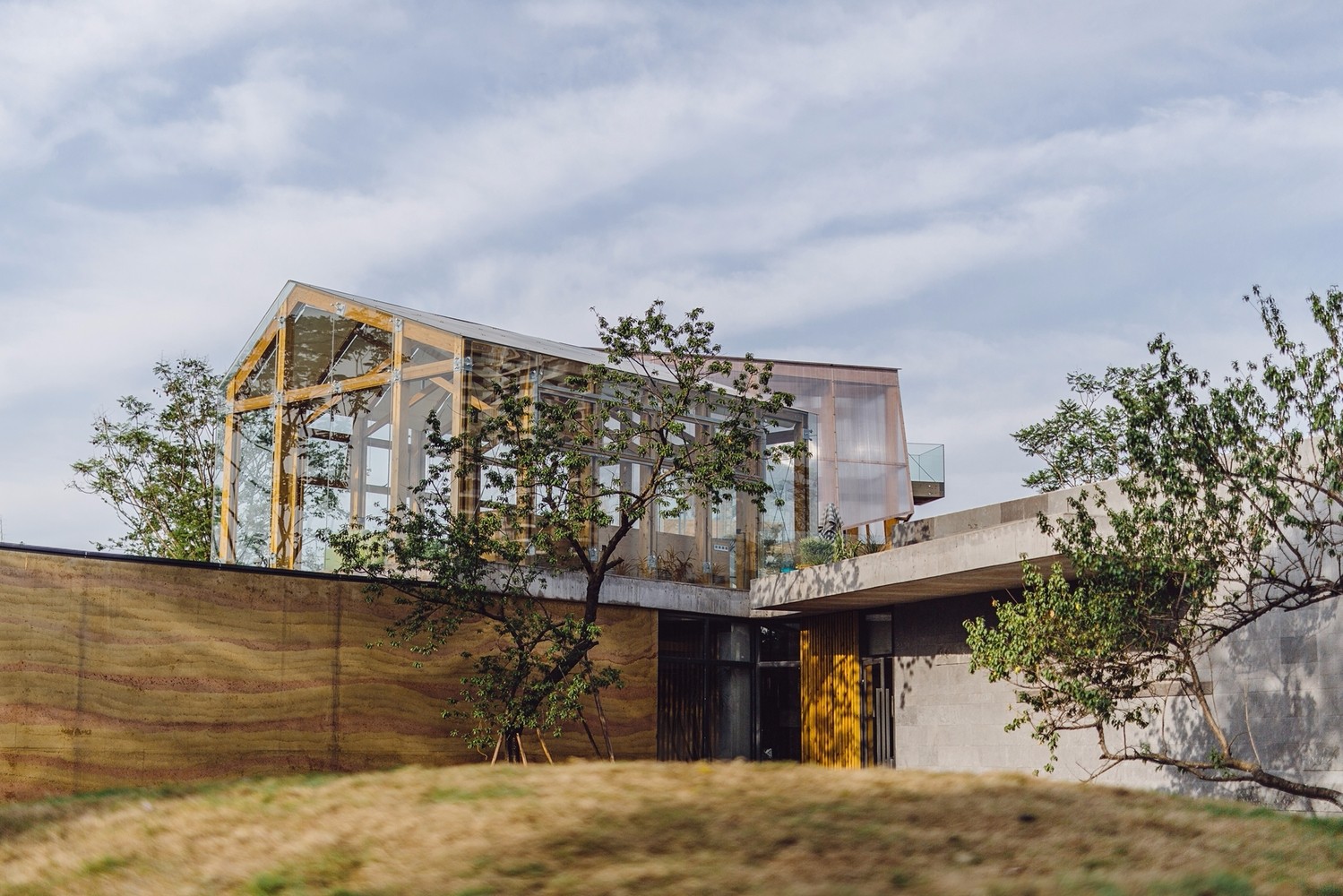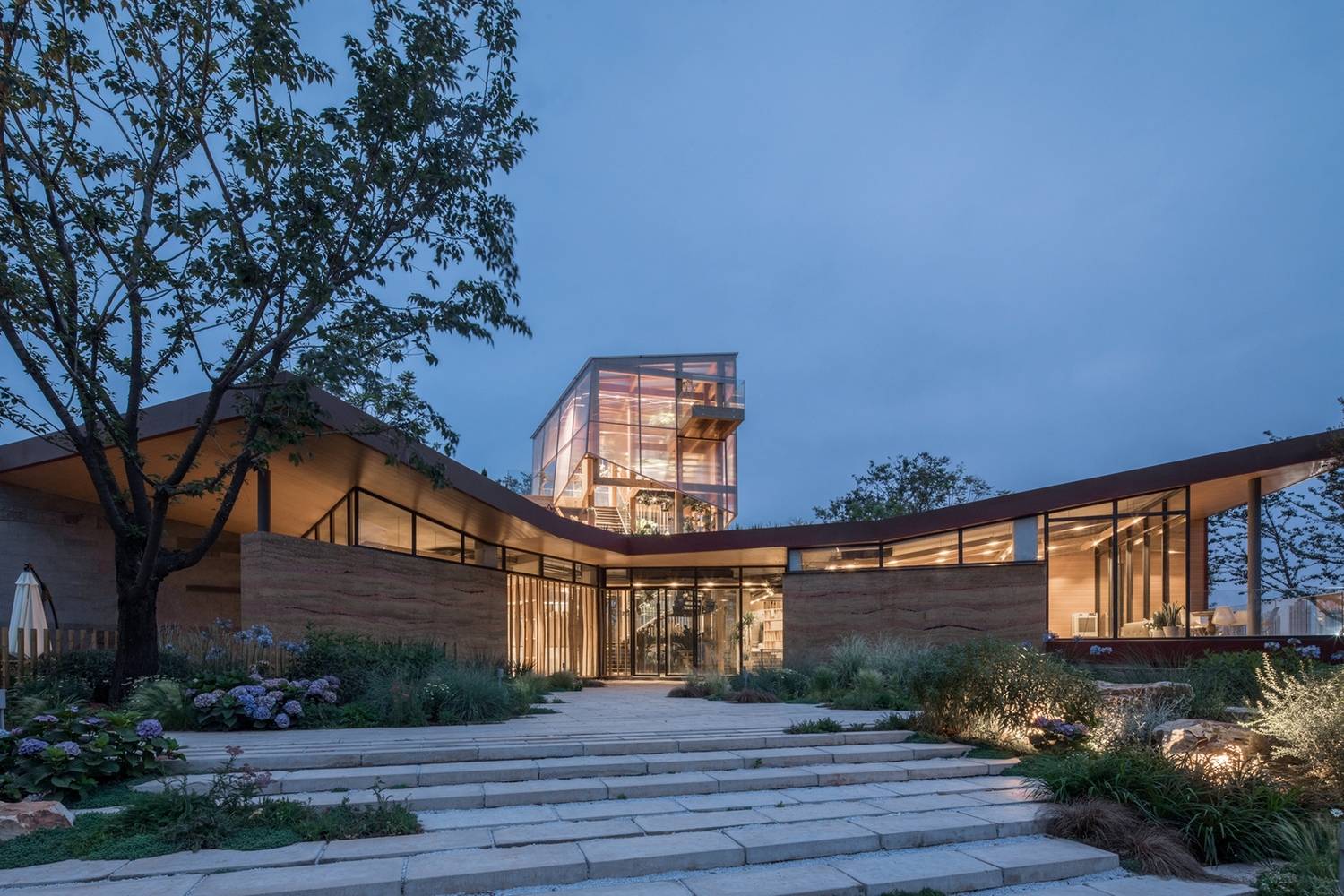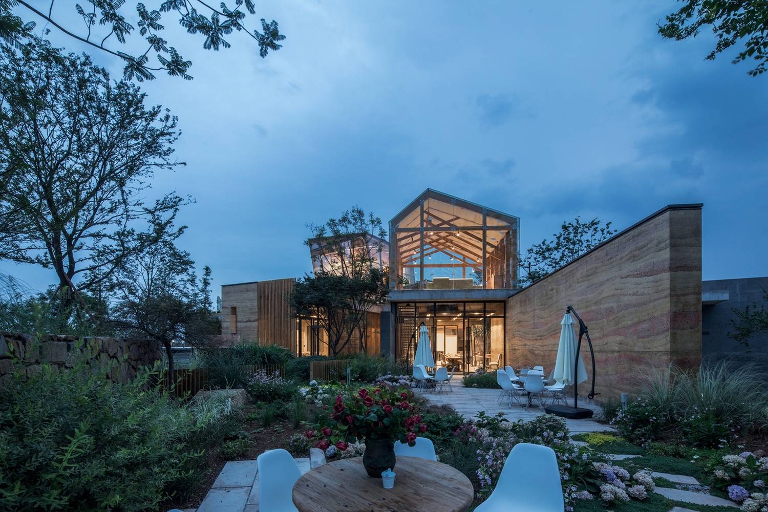 麓客島作為建筑材料試驗場,在花房餐廳中重點嘗試了多材料在混搭下的融合:混搭夯土,木結(jié)構(gòu),石材,讓他們和諧一體