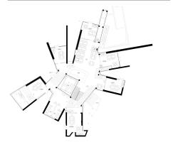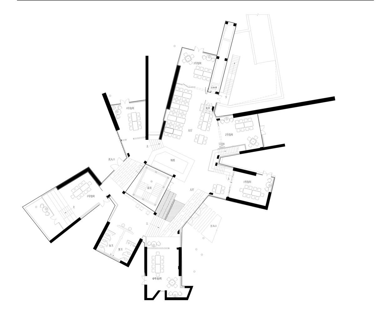 開放區(qū)域作為核心,串聯(lián)起主入口流線以及通向二層的中央溫室,同時也作為餐廳的主要展示空間。而在有大型活動時,部分包間又能打開和主廳連接,形成更大的場所。這種開放與獨立的空間,能在此就餐,聚會,聊天,活動,服務(wù)社群,也符合麓湖“社群理念“。同時發(fā)散狀的包間形態(tài)也促進了建筑和景觀的融合。