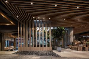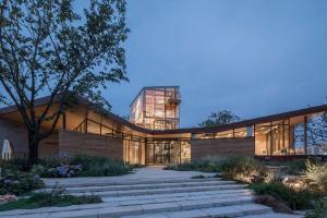 包間的設(shè)計非常細膩: 為保證每個包間都有獨享景觀,一方面需要采用大量落地窗,同時又通過角度錯動和實體片墻,讓臨近包間互不干擾。由于花房餐廳位于島嶼的制高點,有良好的觀湖與觀島條件,設(shè)計中希望將人流引導(dǎo)到二層,采用了“中庭煙囪效應(yīng)“等綠建筑手法, 在二層我們局部增加花房形體,并采用木結(jié)構(gòu)特殊設(shè)計,在屋面上形成特殊的標志形體。
