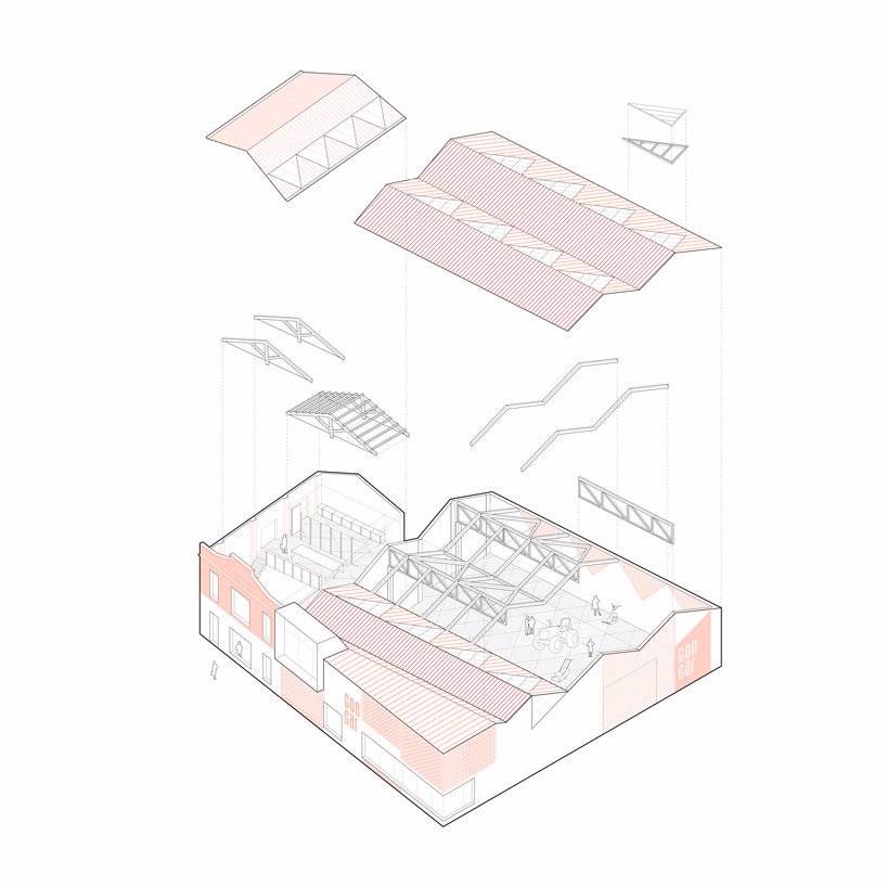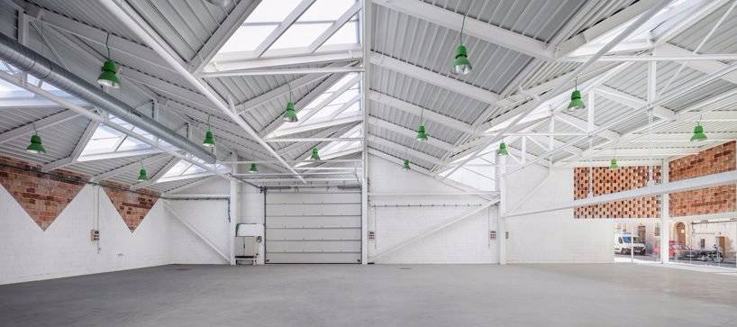 在現(xiàn)有建筑的基礎上新建了一座擁有開放式平面布局的工業(yè)建筑,與原有建筑并肩而立,該體量將主要用作機械車間和展覽空間。廠房主體結(jié)構(gòu)按原有建筑的軸線設計,采用周邊柱支撐的輕鋼結(jié)構(gòu),以適應其梯形平面的局限性。北向設置了一系列三角形天窗將大量的自然光引入到625平方米的空間中。