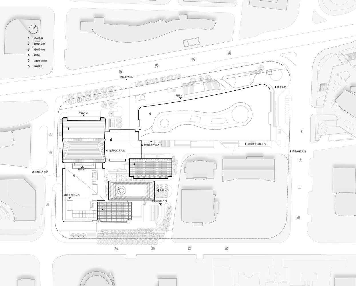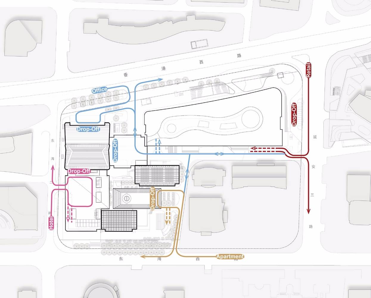 從傳統(tǒng)建筑群到現(xiàn)代化片區(qū),本案所處區(qū)位如城市的年輪,多種空間感受逐漸疊加融合,從都市到海濱可能僅一街之遙,空間意向在建筑體塊的投影、聯(lián)結(jié),猶如自由穿行于人工與自然,商業(yè)與文化之間的理念表達。