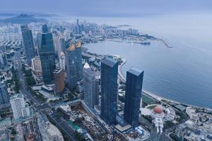 聚焦青島現(xiàn)代化濱海區(qū)域浮山灣,青島深藍中心超高層綜合體項目作為核心區(qū)最后一塊城市拼圖嵌入濱海天際線。在此處,閑適與高效的生活方式,嶄新與積淀的城市面貌接壤對話,充分演繹著對現(xiàn)代生活的釋義與暢想,及濱海城市界面的豐富性。