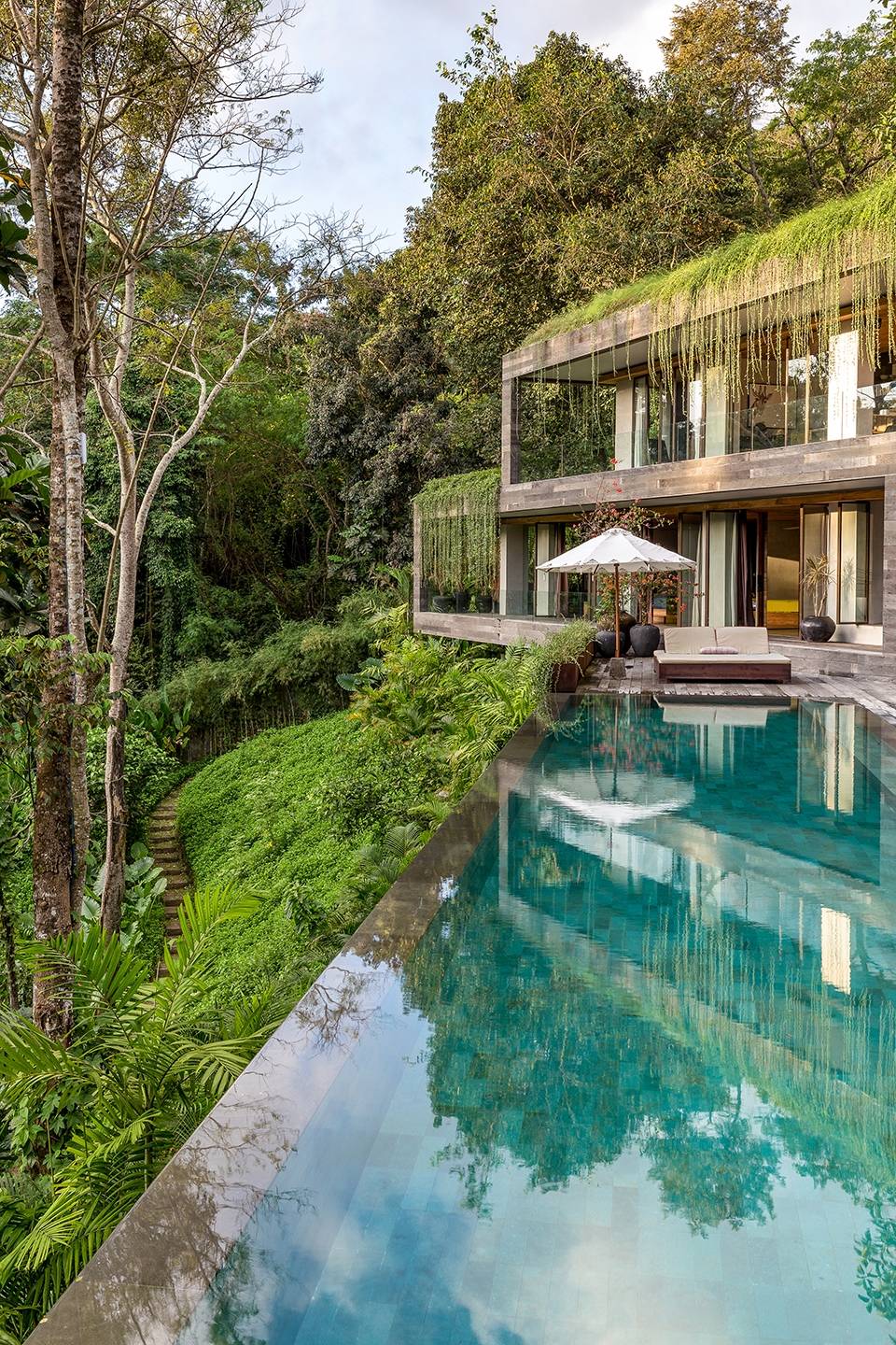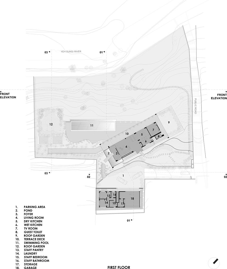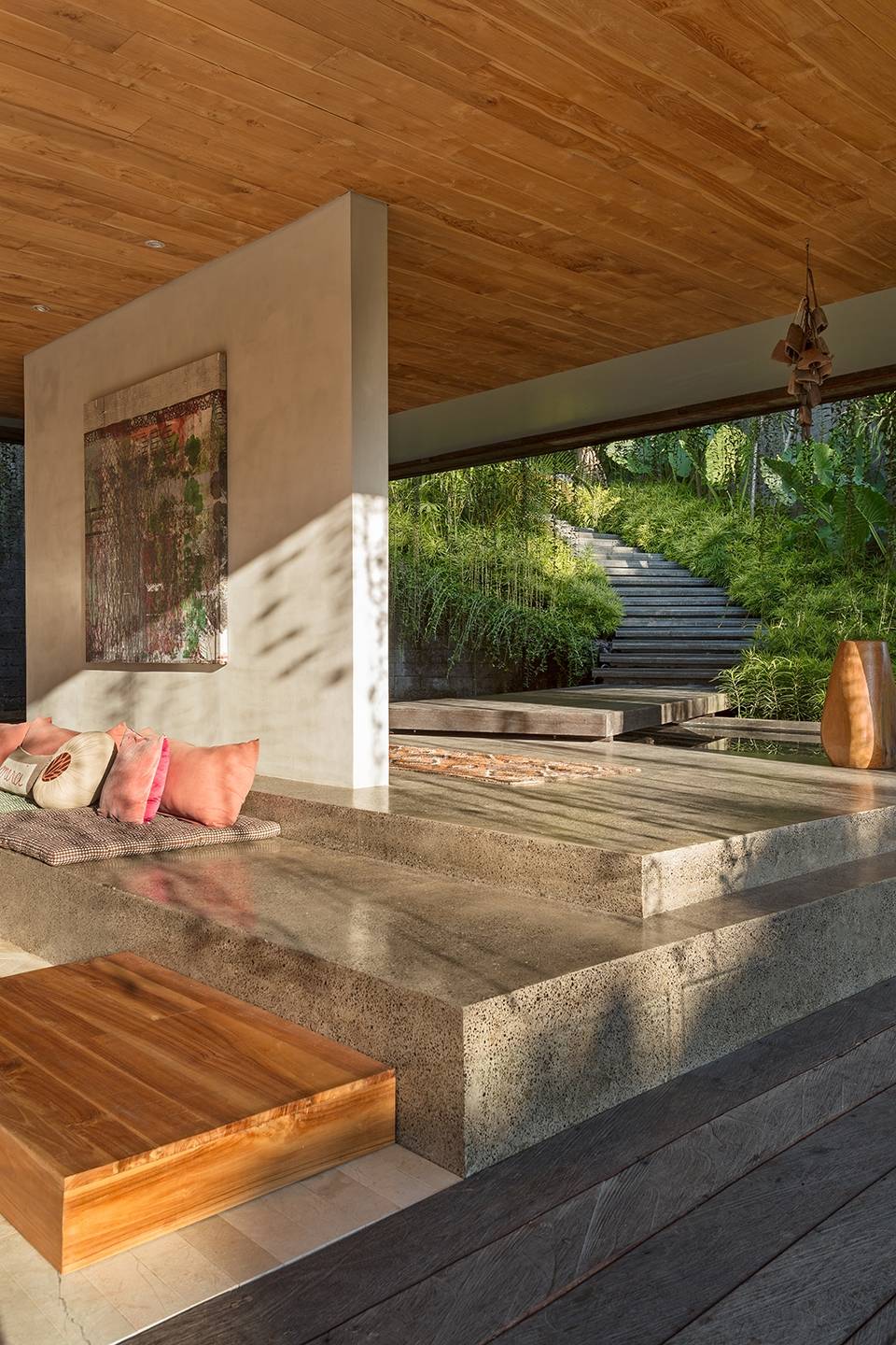 基于巴厘島的建筑傳統(tǒng),別墅的多個(gè)體量分別容納了不同的功能空間。所有的公共區(qū)域均向室外環(huán)境開(kāi)放;臥室和其他更加私密的空間如辦公室、健身房和媒體室等,均可以根據(jù)需要來(lái)調(diào)整開(kāi)放度。建筑團(tuán)隊(duì)自到達(dá)停車場(chǎng)的一刻起便感受到了一種充滿探索感的氛圍。首先呈現(xiàn)在眼前的是一望無(wú)際的森林;再向前走,則能夠俯瞰到下方建筑的屋頂;而位于最深處的則是客人臥室所在的一層空間。