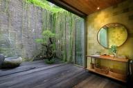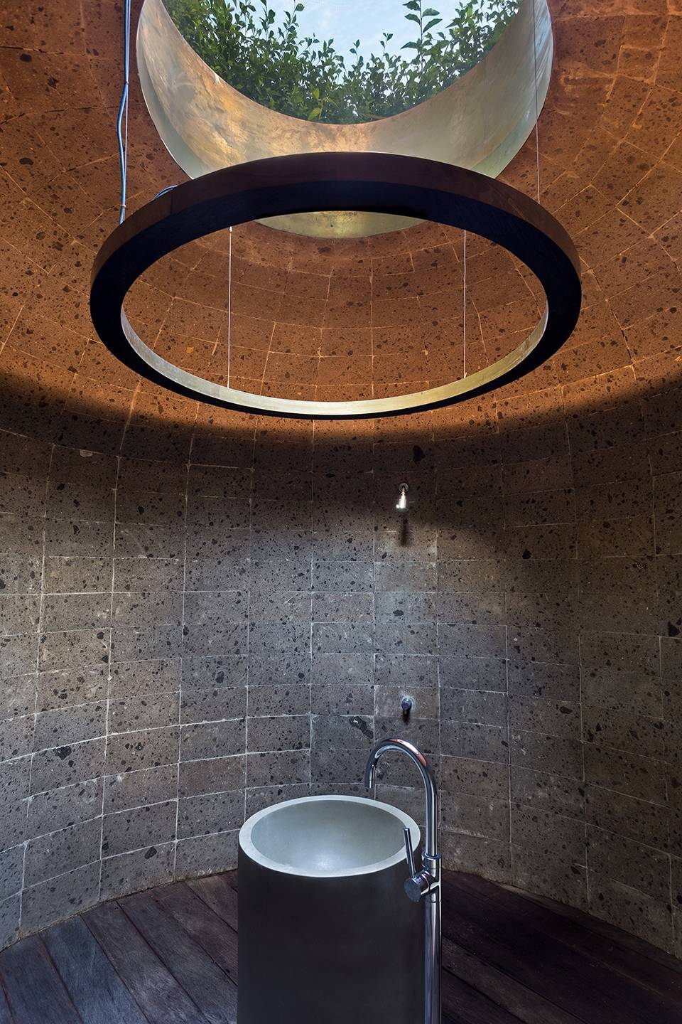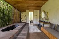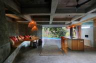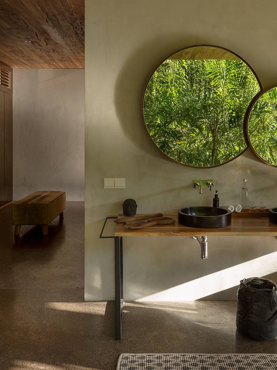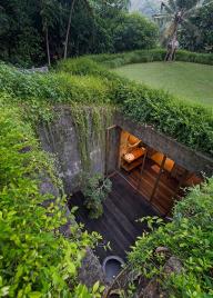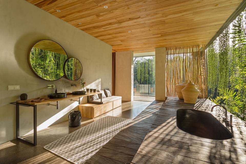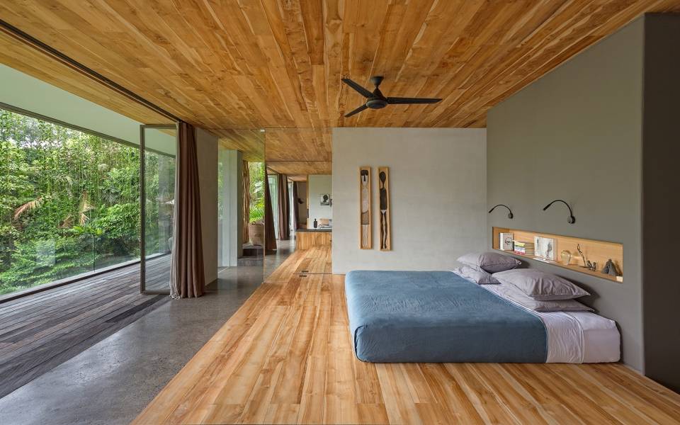 基于巴厘島的建筑傳統(tǒng),別墅的多個(gè)體量分別容納了不同的功能空間。所有的公共區(qū)域均向室外環(huán)境開(kāi)放;臥室和其他更加私密的空間如辦公室、健身房和媒體室等,均可以根據(jù)需要來(lái)調(diào)整開(kāi)放度。建筑團(tuán)隊(duì)自到達(dá)停車場(chǎng)的一刻起便感受到了一種充滿探索感的氛圍。首先呈現(xiàn)在眼前的是一望無(wú)際的森林;再向前走,則能夠俯瞰到下方建筑的屋頂;而位于最深處的則是客人臥室所在的一層空間。