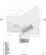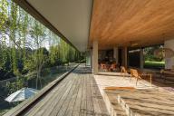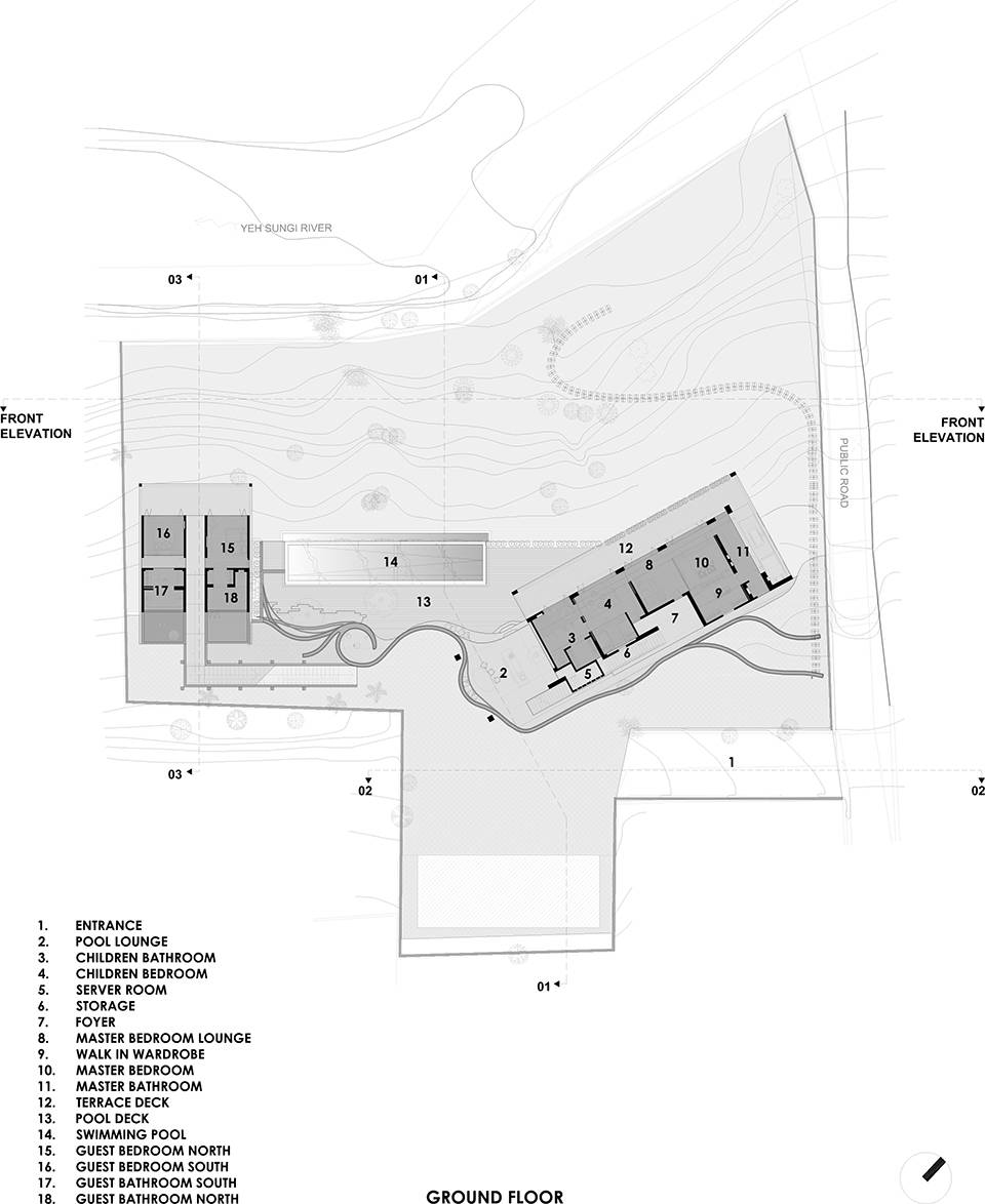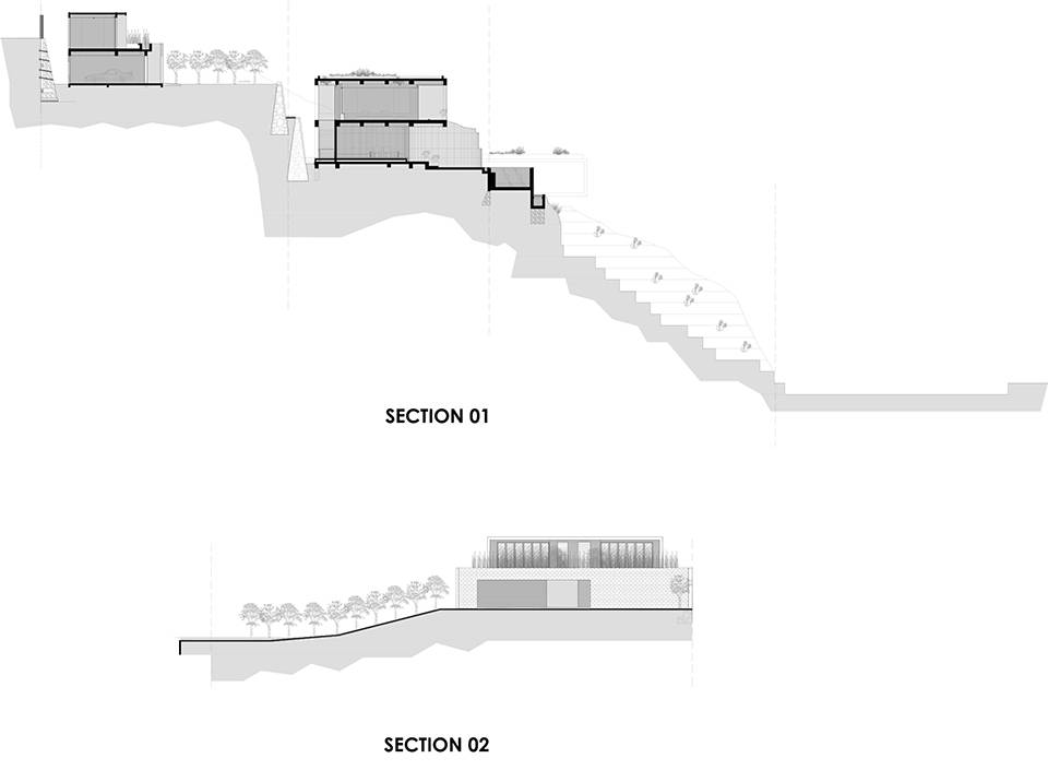 基于“景觀化的建筑”這一理念,建筑師對(duì)自然環(huán)境與建筑之間的界限進(jìn)行了柔化,最終使建筑與其所在的地理環(huán)境融為一體,呈現(xiàn)出在自然中時(shí)隱時(shí)現(xiàn)的效果。別墅的兩個(gè)體量以等高線為依據(jù)被布置在場(chǎng)地的不同位置,以便更好地引入下方河流和森林的視野,同時(shí)在兩個(gè)體量之間營(yíng)造出數(shù)個(gè)戶外空間和花園——這在如此陡峭的土地上可謂是一種難得的體驗(yàn)。