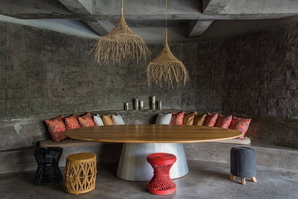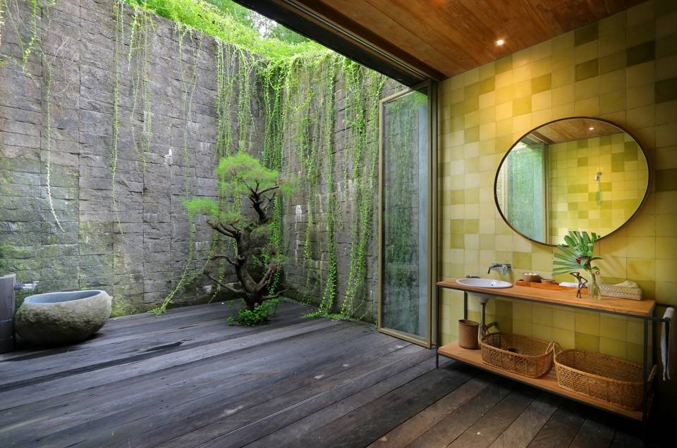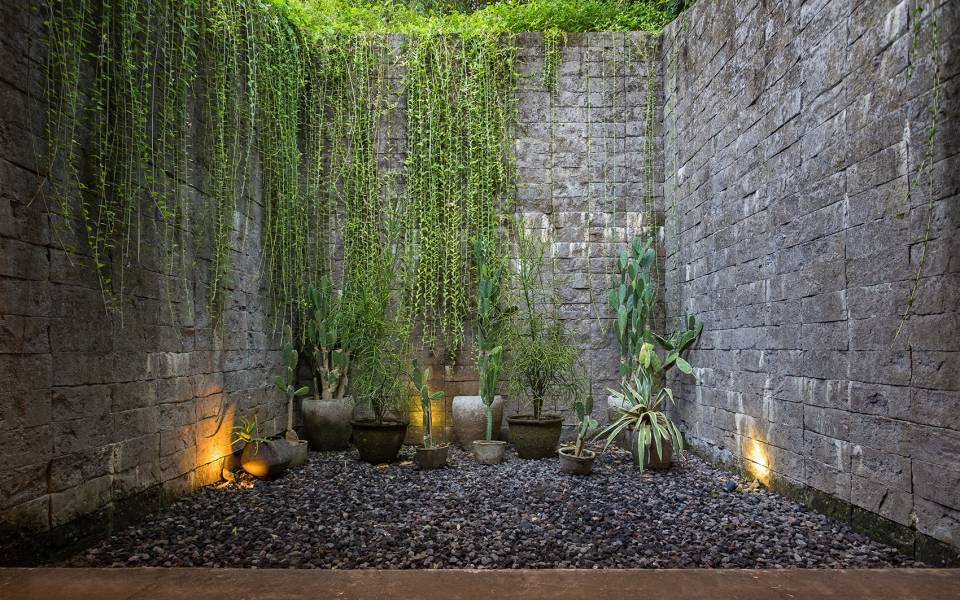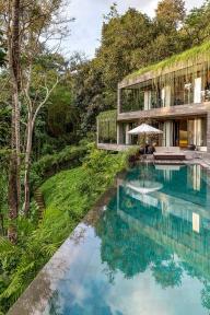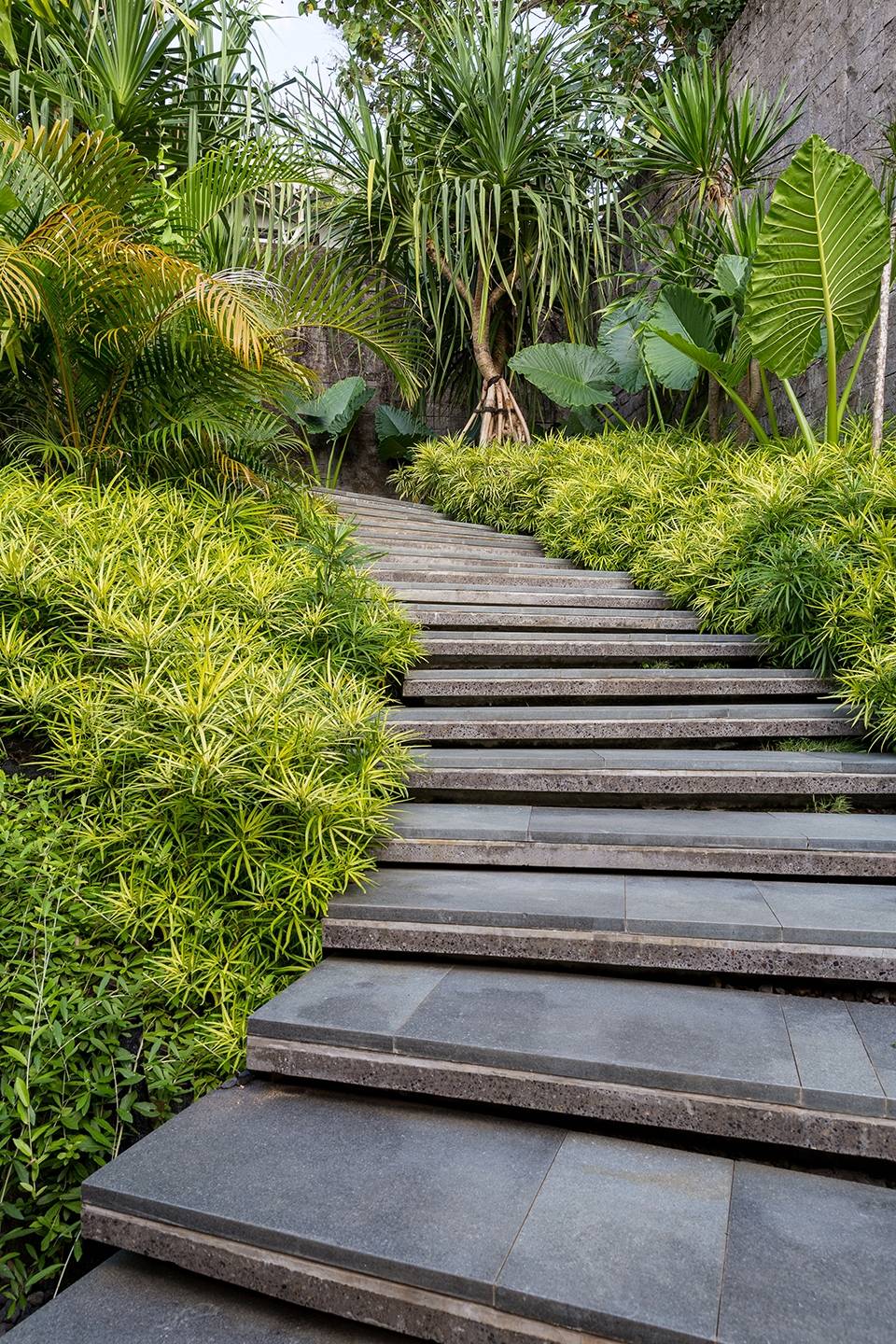 Chameleon別墅位于巴厘島西南岸的Buwit地區(qū),周圍環(huán)繞著蔥郁的樹(shù)木。別墅被建造在一個(gè)面積為1英畝的陡峭場(chǎng)地上,能夠俯瞰下方茂密的樹(shù)林與緩緩流淌的河流。入口所在的平面與場(chǎng)地西側(cè)的河流所在平面的高度差達(dá)到11米。這一特殊的地理位置對(duì)建筑師提出了挑戰(zhàn),即需要打造與周圍環(huán)境及地形完美結(jié)合的建筑。