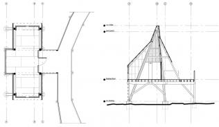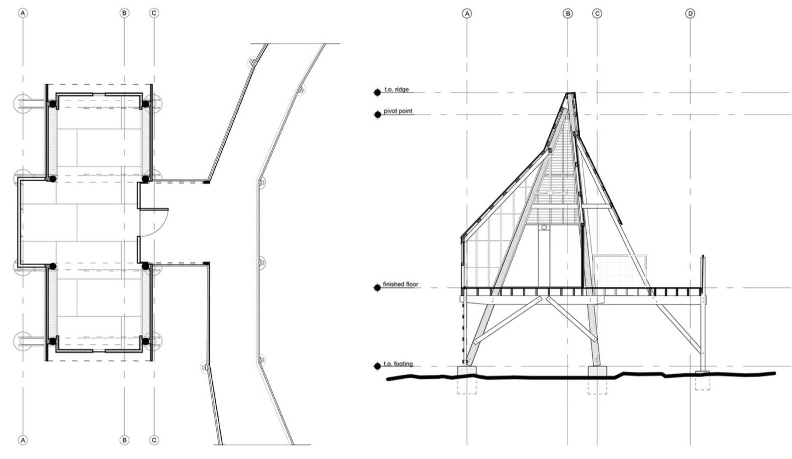 架空的連接步道串聯(lián)了全部的6個(gè)小屋,并在中間通向了公共隊(duì)屋,在那里的的坡地上可以在底部加建一層供淋浴和貯藏的空間。樓梯和一個(gè)小吊椅升降機(jī)直接連接了樹屋和樹林地面,并且直接通向所有湖邊營地都不可或缺的一個(gè)設(shè)施——營火堆。