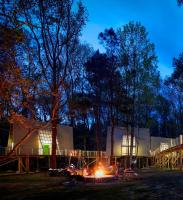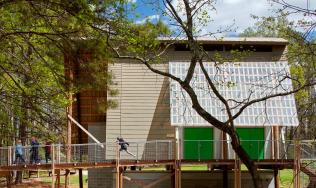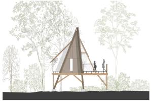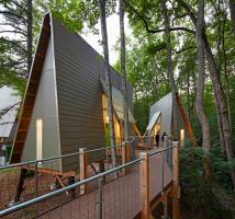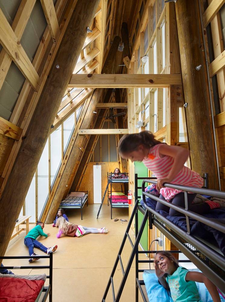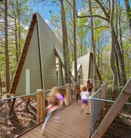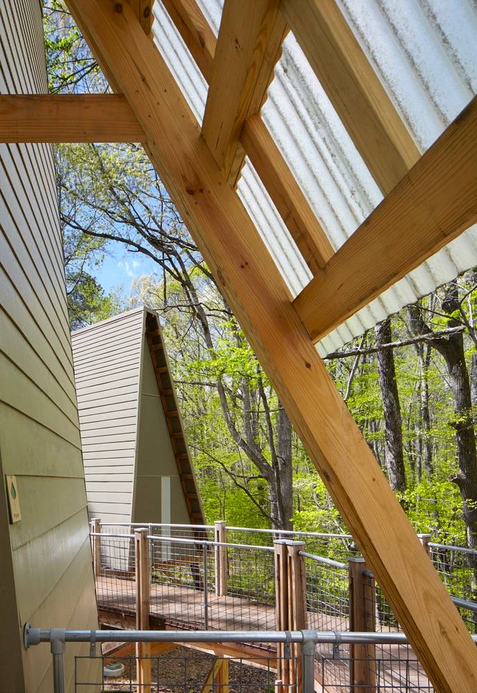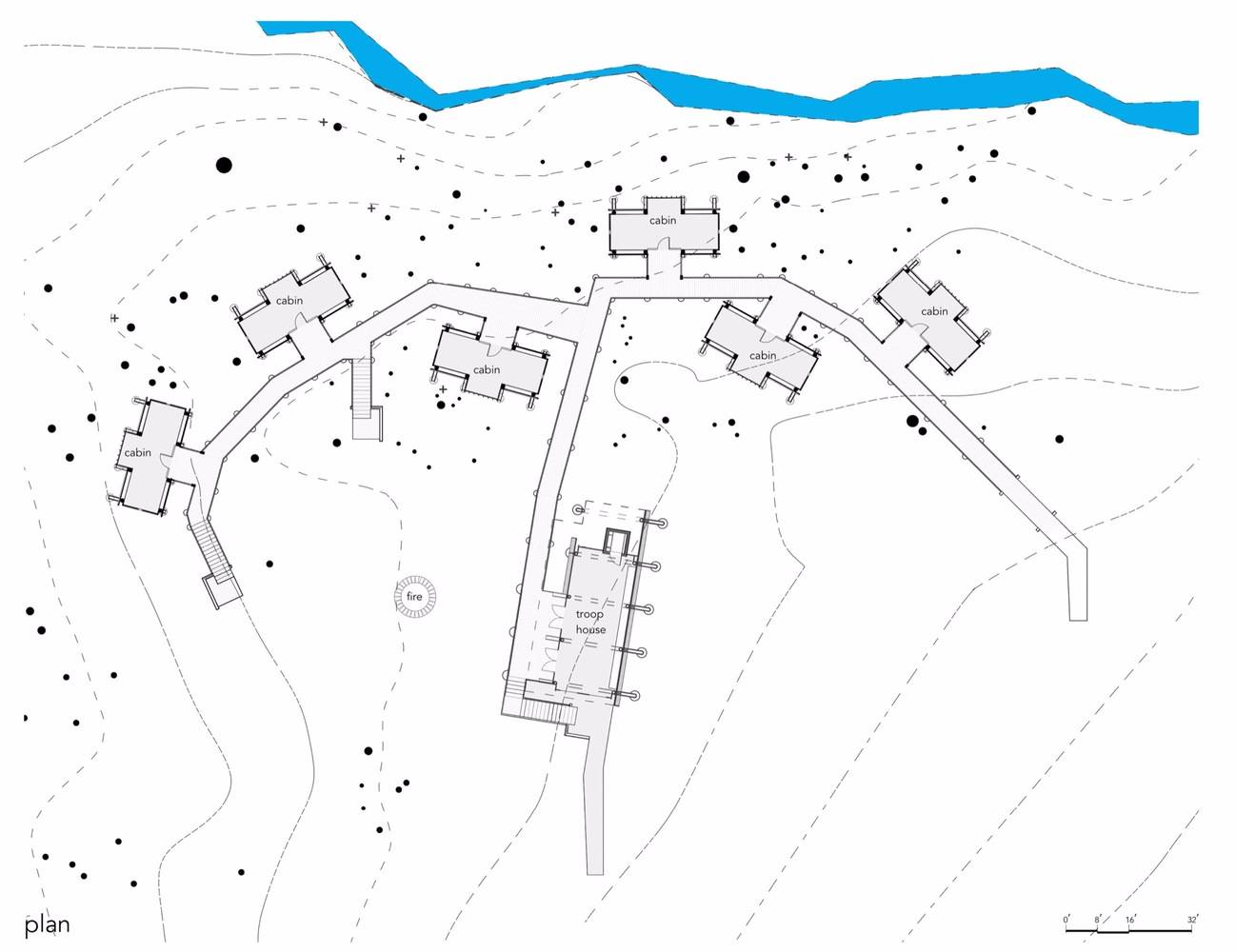 這個(gè)新的、可容納36人的場所包括了一系列沿著森林的邊緣修建的木桿結(jié)構(gòu),這些結(jié)構(gòu)是由被抬高了的道路連接起來的,這些道路在原始樹木的樹干之間蜿蜒著。該建筑群由六個(gè)樹屋單元組成,每個(gè)單元設(shè)計(jì)為每個(gè)十二個(gè),一個(gè)浴室,一個(gè)程序亭和篝火圈。這些單元將通過高架走道連接,還包括電梯,符合美國殘疾人法案規(guī)定的可達(dá)性。并在樹林中蜿蜒曲折。制造樹屋的一個(gè)挑戰(zhàn)是在修建的過程中不能對(duì)原始的樹木造成任何的傷害,而且還要求所有的露營者都能夠使用它們。格雷漢姆營地結(jié)構(gòu)被很高的木桿支撐著,這些木桿輕輕的觸碰著腳下的土地。