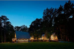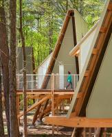這些位于周圍不規(guī)則樹干之間的木桿互相傾斜著,變成了森林的一部分。這些框架被覆蓋在了帳篷的下面,帳篷是由半透明而又堅(jiān)固的材料制造而成的,這些材料調(diào)皮的捕捉和傳輸著穿過了天然的樹冠的、帶有斑點(diǎn)的陽光。