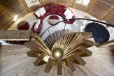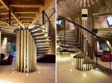 內(nèi)部呈蜘蛛網(wǎng)結(jié)構(gòu),一欄欄長長的豎曲線在最頂端相匯,與之垂直的木板橫跨它們呈精巧的同心圓,沿墻體結(jié)構(gòu)一路下降。建筑的空間包括一個開放的環(huán)形平面布局,圍繞著中央的懸臂式木樓梯布置。一樓包括起居室、餐廳以及閣樓下面的小廚房,它占據(jù)了樓梯下方一半的空間。