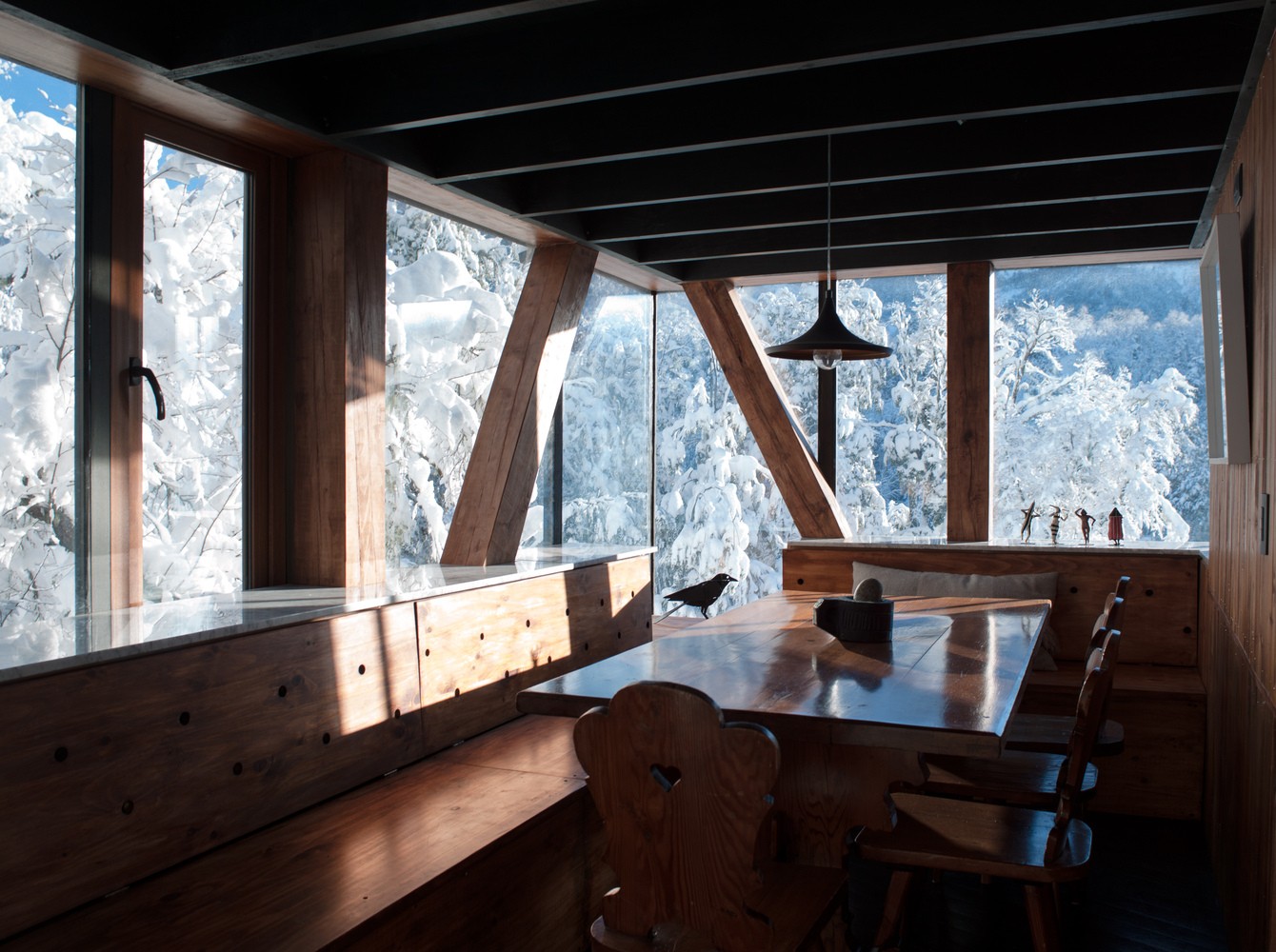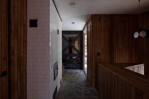 在材料方面,該設(shè)計(jì)使用天然的林木作為內(nèi)部飾面,并按照雅庫蘇技術(shù)采用外部燒焦的針葉樹板作為通風(fēng)立面的外部飾面,以增加絕緣性能,減少建筑上對(duì)化學(xué)品的使用??偠灾?,這座住宅充分遵循了被動(dòng)式的設(shè)計(jì)原則,以豎向感強(qiáng)烈的集中式體量中不但做到了良好的保溫隔熱性能,還與原始的山區(qū)景觀相互融合。