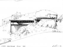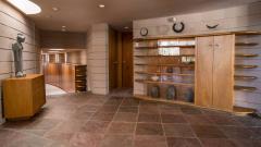 建筑有著流暢、層疊的水平曲線輪廓,映襯著周邊同樣起伏的山形,同時反映出賴特建筑的有機特征。