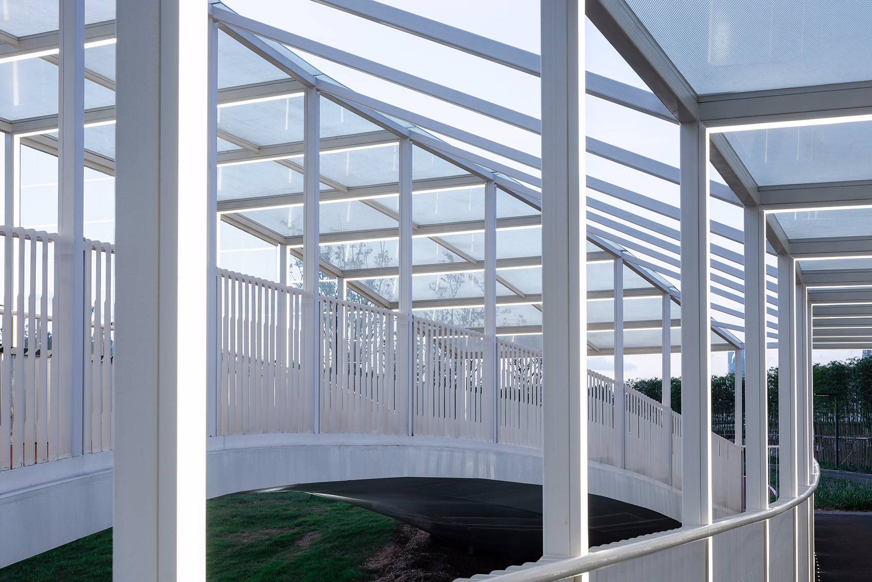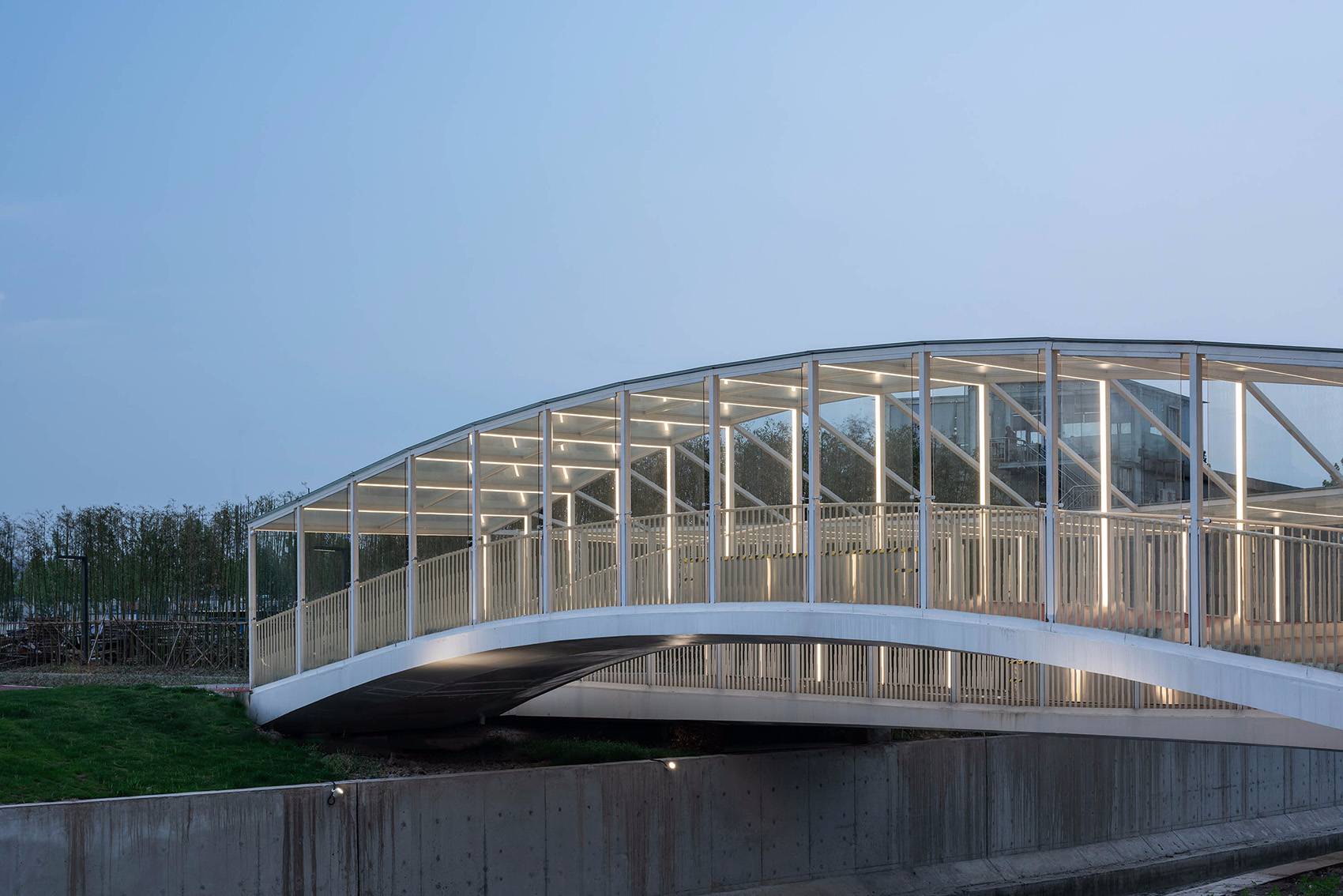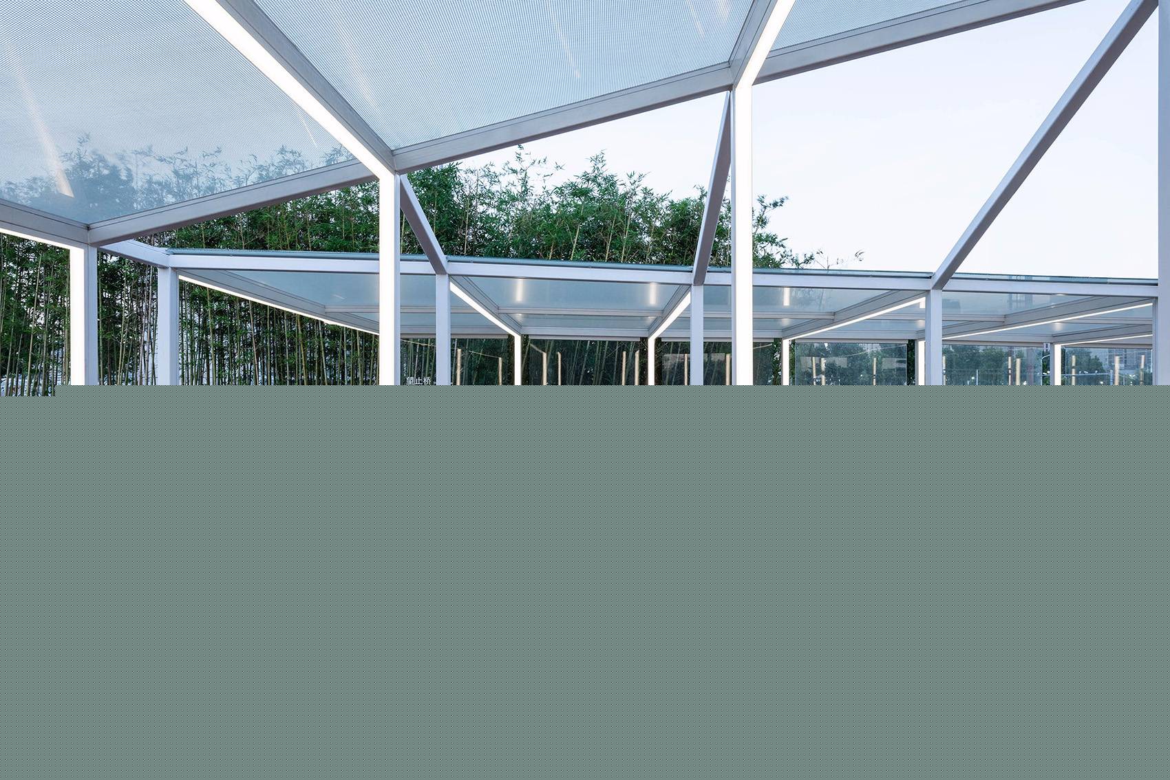 設(shè)計(jì)的初期,并沒(méi)有將橋梁封閉的打算,后來(lái)為了遵從整體布局,這里需要補(bǔ)充一個(gè)可以避雨的駐足點(diǎn),于是,在等高升起欄桿、增設(shè)屋蓋并橫向結(jié)構(gòu)連接后自動(dòng)形成了一個(gè)曲線折坡屋面,之后,在兩個(gè)橋梁的外側(cè)加設(shè)有縫隙通風(fēng)的大玻璃進(jìn)行大致封閉,于是,倪家浜橋這個(gè)更加接近于一個(gè)構(gòu)筑物的橋梁就誕生了。