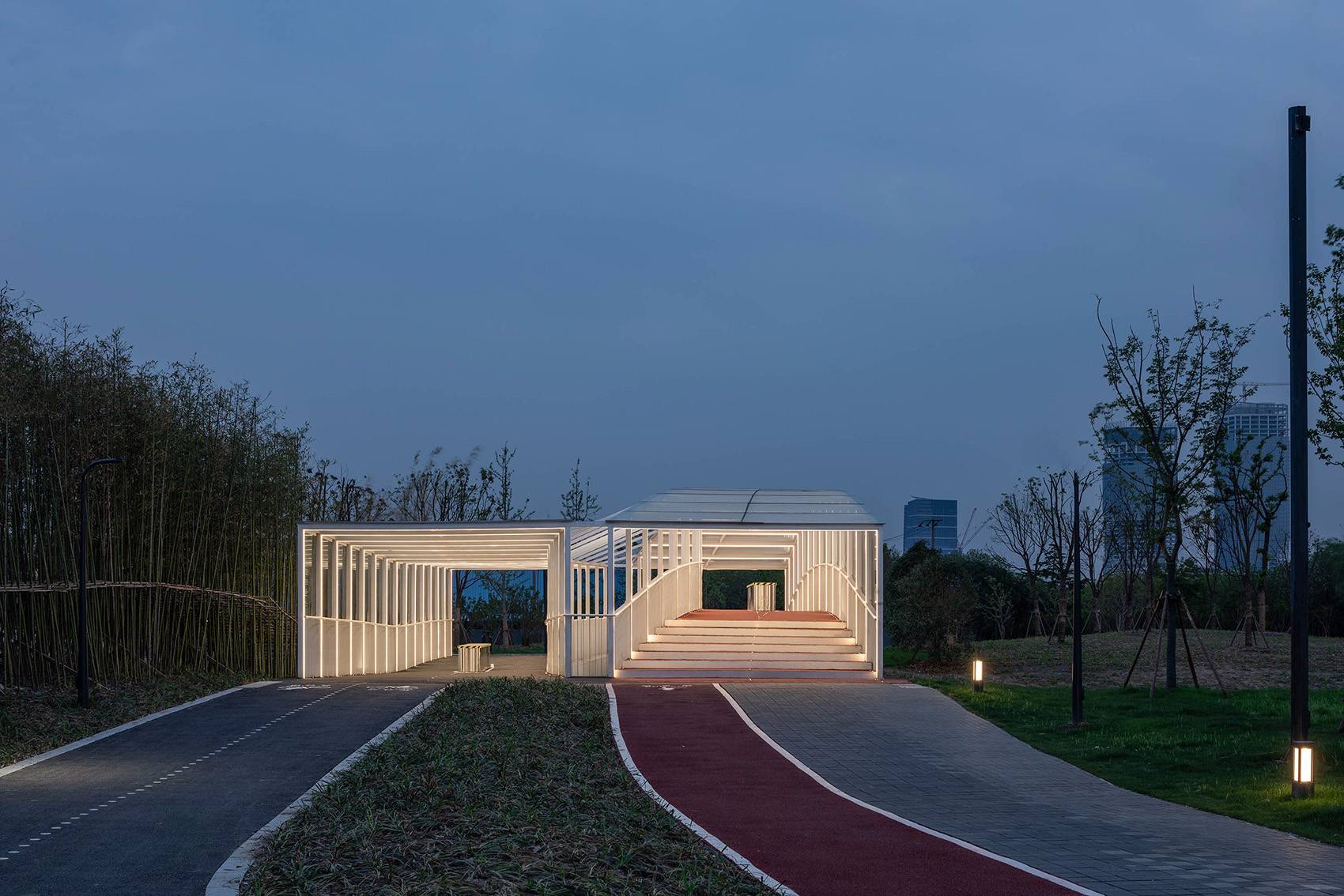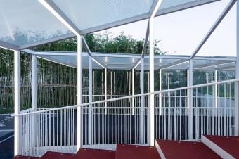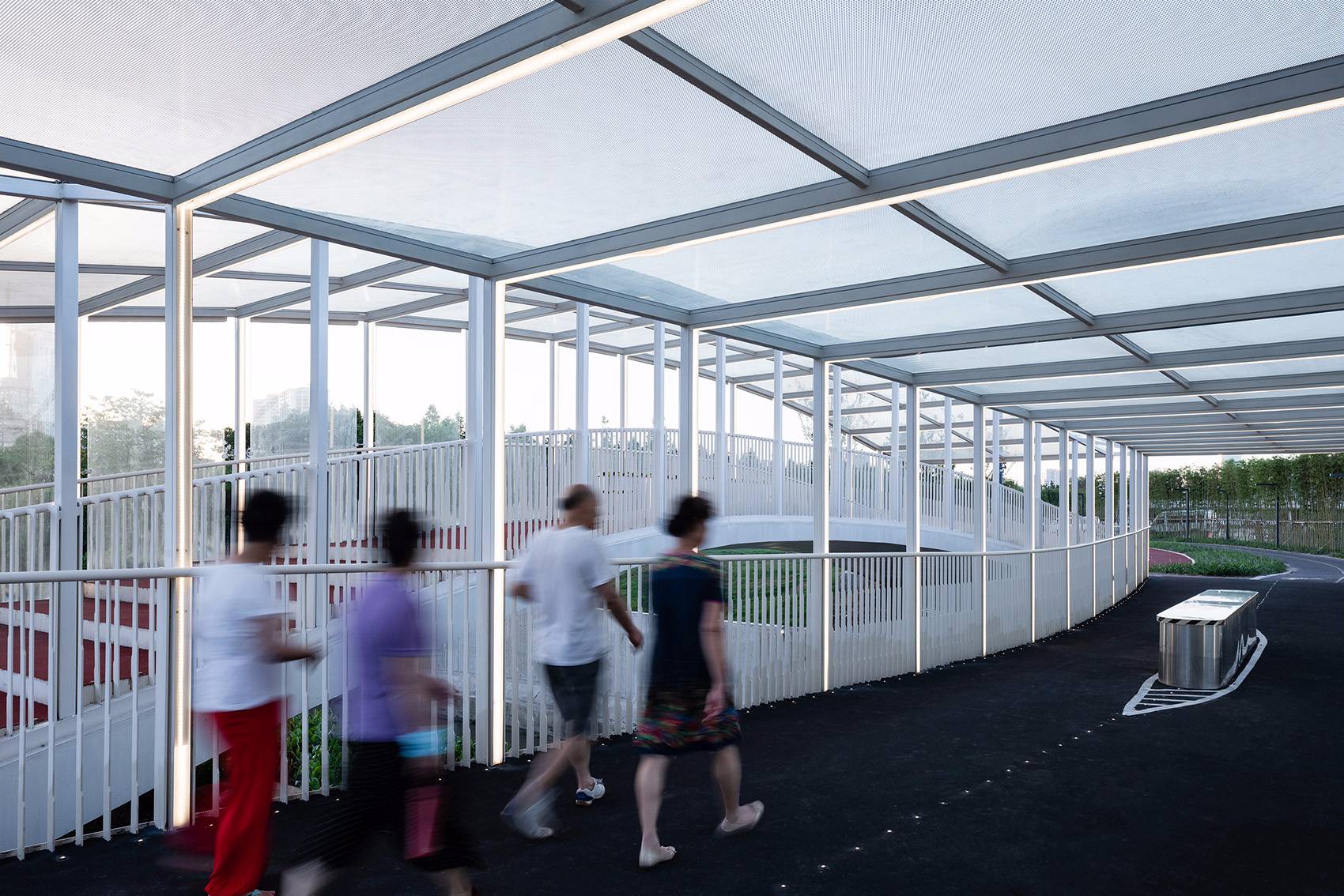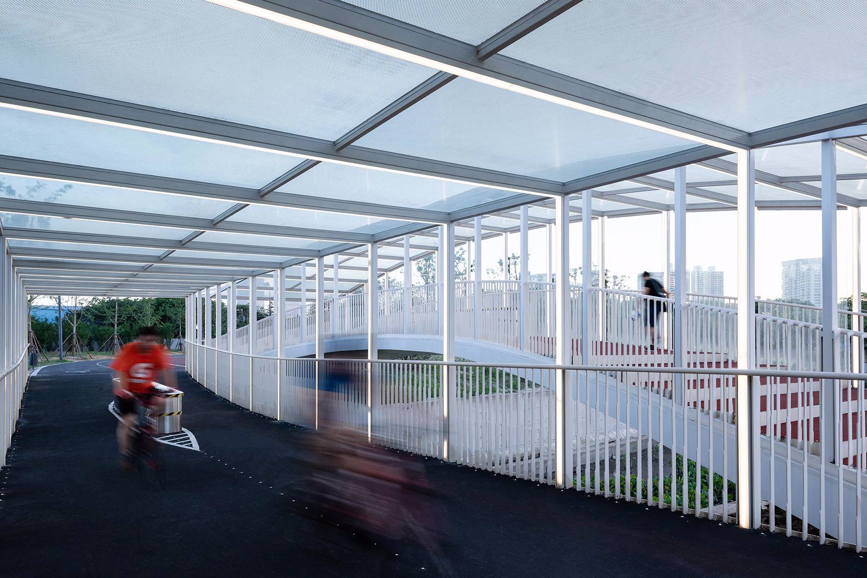 設(shè)計(jì)的初期,并沒(méi)有將橋梁封閉的打算,后來(lái)為了遵從整體布局,這里需要補(bǔ)充一個(gè)可以避雨的駐足點(diǎn),于是,在等高升起欄桿、增設(shè)屋蓋并橫向結(jié)構(gòu)連接后自動(dòng)形成了一個(gè)曲線折坡屋面,之后,在兩個(gè)橋梁的外側(cè)加設(shè)有縫隙通風(fēng)的大玻璃進(jìn)行大致封閉,于是,倪家浜橋這個(gè)更加接近于一個(gè)構(gòu)筑物的橋梁就誕生了。