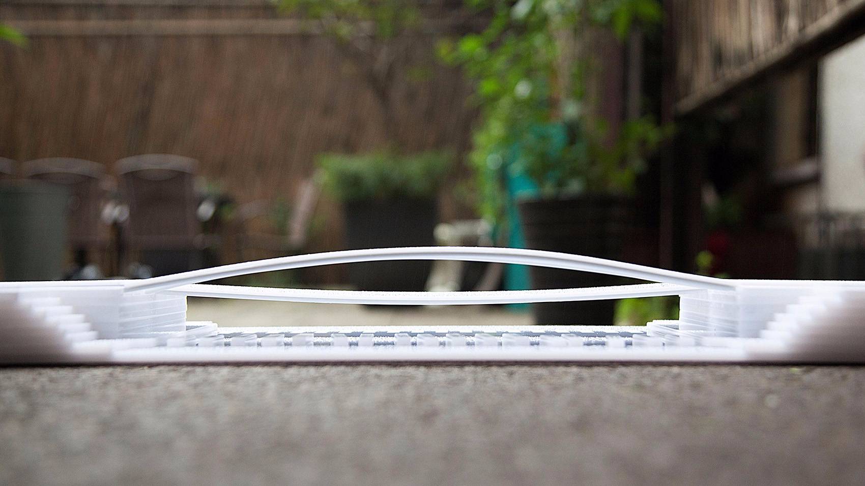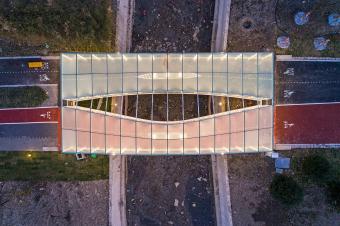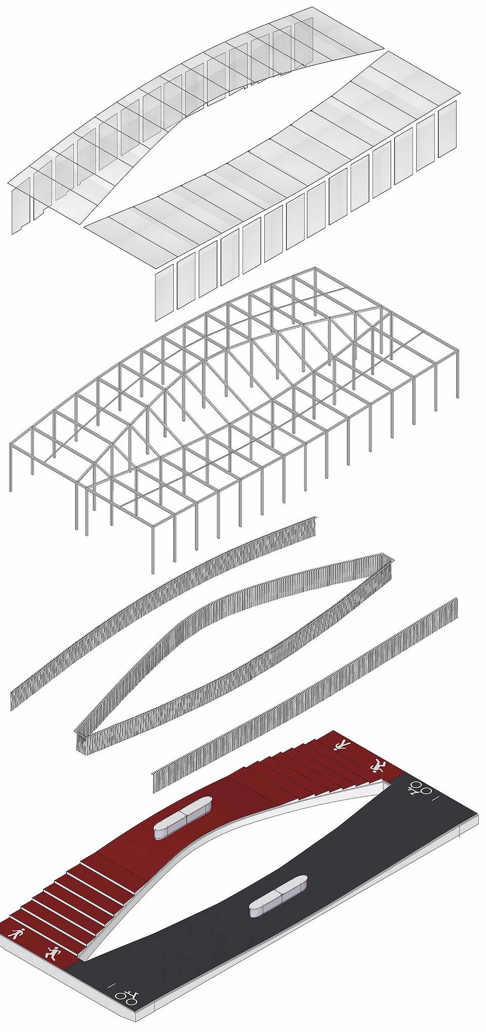 由于跨度較小,只有30米,所以這座人行橋更接近大型公共空間中的裝置尺度。在拆解人行橋的三股交通即人行、跑步、自行車之后,進(jìn)而根據(jù)速度及坡度將一座人行橋拆分為兩座獨(dú)立的橋梁:一座拱橋服務(wù)于人行及跑步,一座吊橋服務(wù)于自行車,而拱橋及吊橋也是一跨過(guò)河的最經(jīng)濟(jì)方式。也就是說(shuō),這種拆分是滿足功能和建構(gòu)的一種普適原型。