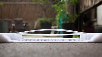 垂直拆分上下之后,兩座橋平面之間也利用了兩種外凸曲線方式進(jìn)行第二步拆分,即一條弧線和一條倒角折線,這樣減輕了橋梁中部的荷載,并在兩橋之間形成了一個(gè)眼睛般的空隙。