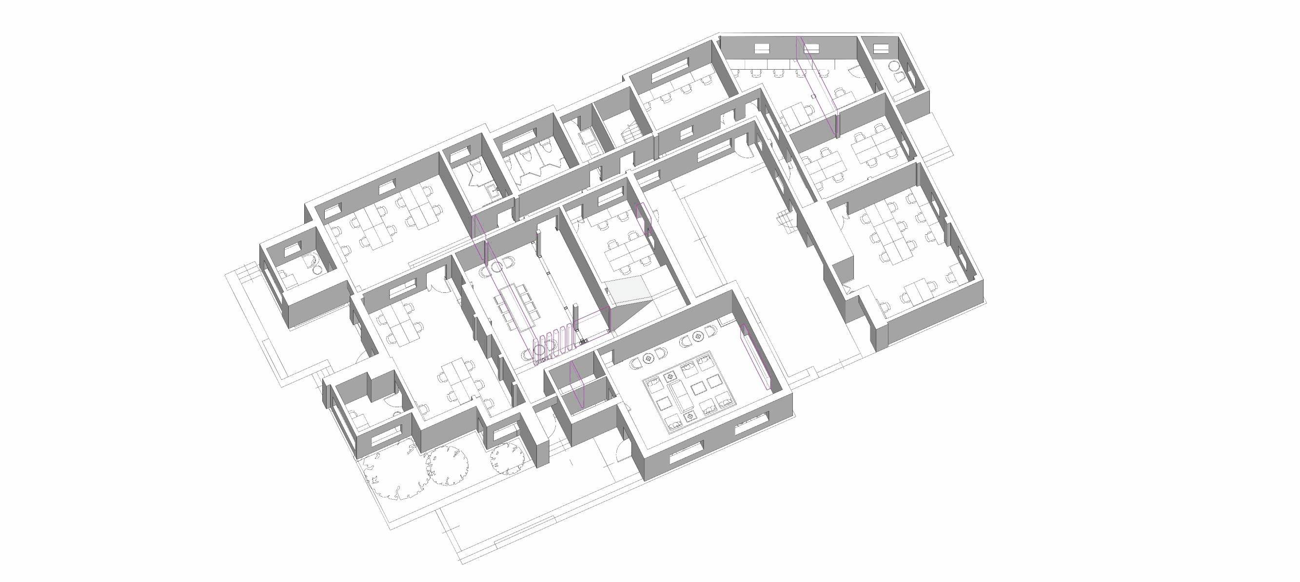 通過由外而內的延伸,我們首先把貫穿三層空間的法式雕花木質樓梯“挖“出來,明確了整個空間流線,而所有辦公區(qū)域則依窗格而設,讓陽光、空氣、植物氣息流進來。為了保證空間整體的連續(xù)性,我們盡可能不去打破,不去增加無謂的修飾,不過分強調風格造型,而是通過材料、色彩等設計元素的變化去區(qū)分空間的功能。