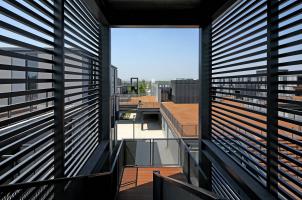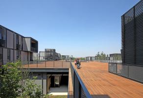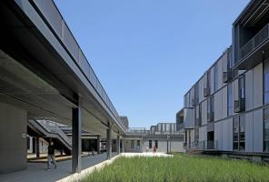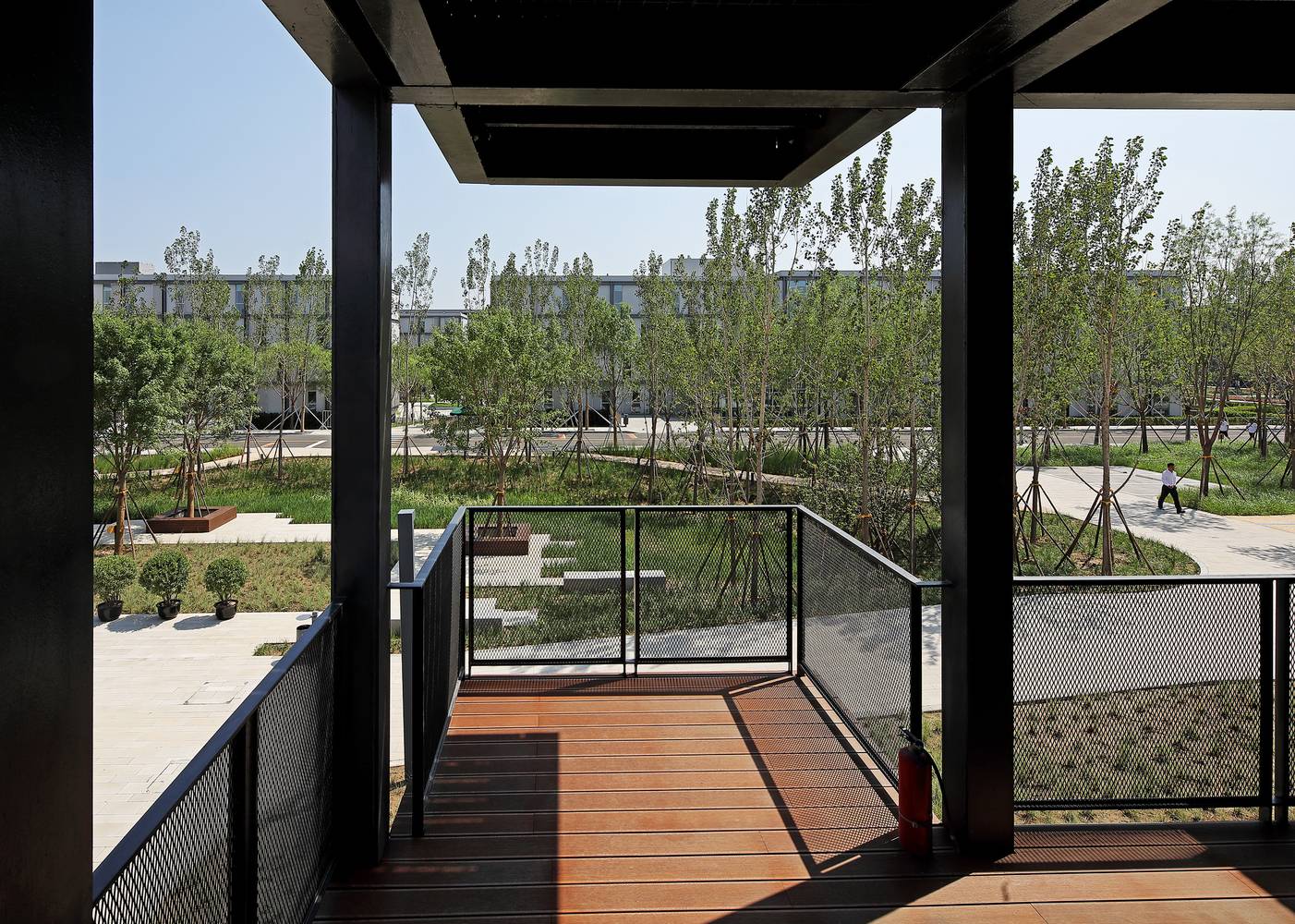 在這里有著與自然最為親近的關(guān)系。建筑并沒有沿基地的周邊布置,而是緊靠中部的共享商業(yè)街,在外側(cè)空出大量的綠化空間。起伏的微地形自然地形成雨水花園,工作之余你可以沿著彎曲的漫步道走一走,也可以到鑲嵌其間的籃球場、羽毛球場活動一下。建筑的各層都退出了許多屋頂平臺,給在這里辦公的人提供了交流和活動的空間。