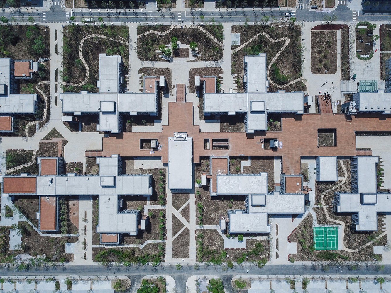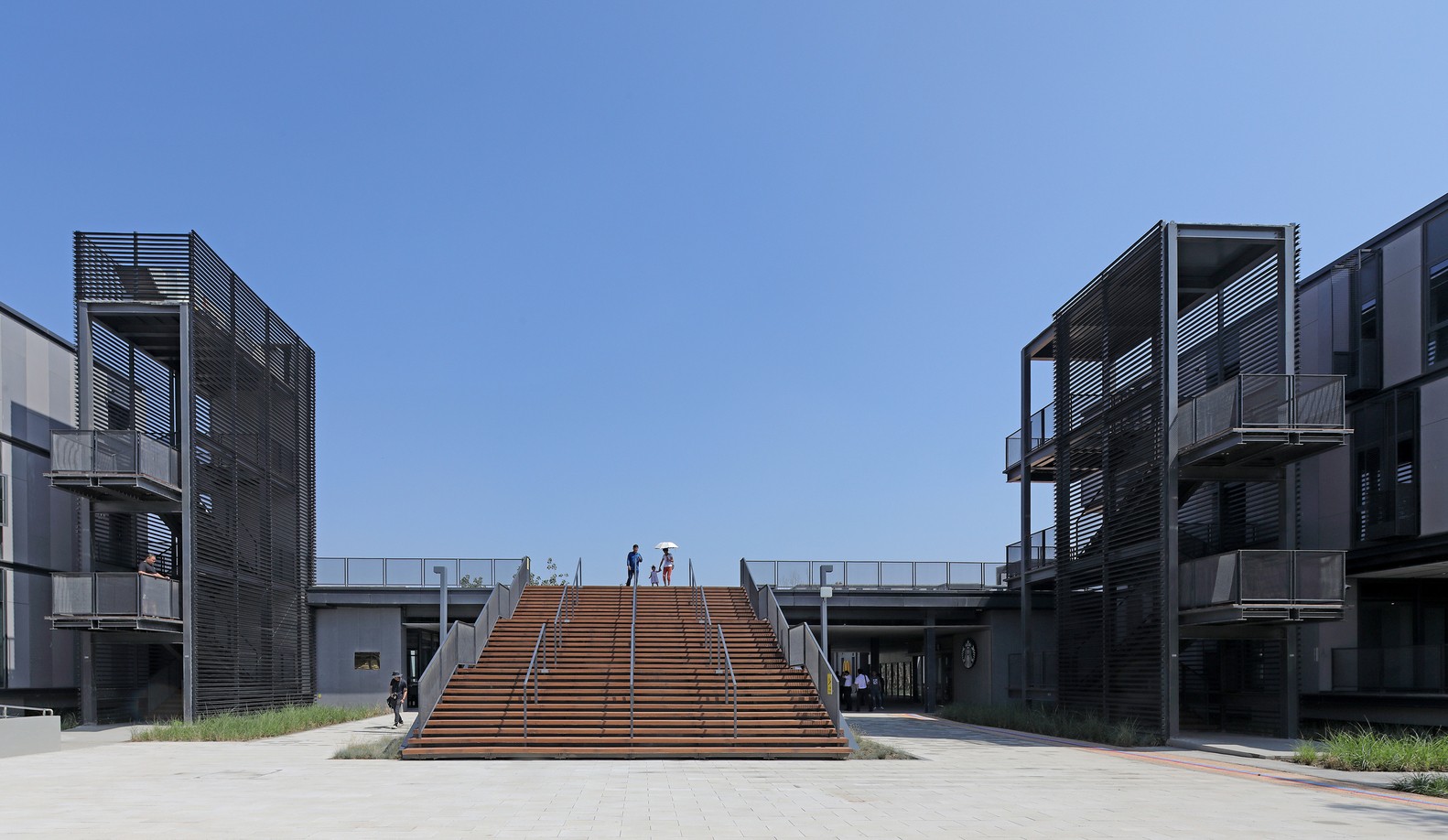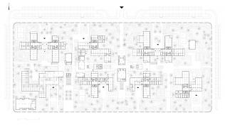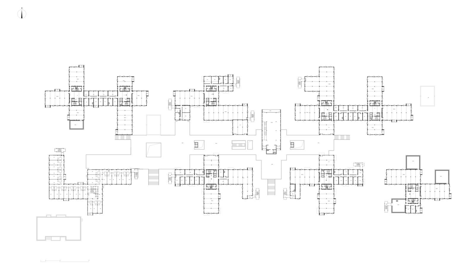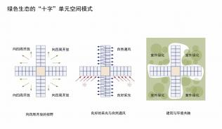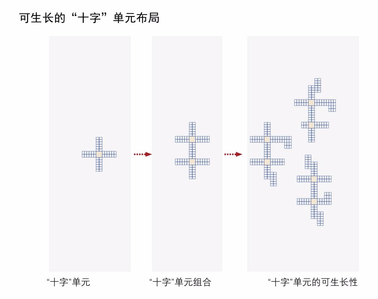 十字形的平面使建筑呈現(xiàn)一種對周邊環(huán)境開放的姿態(tài),建筑貼近綠化,融入自然;小進(jìn)深可以實現(xiàn)最大化的自然通風(fēng)采光。每個“十字”單元再經(jīng)過局部變形、組合,向外自然生長,蔓延于環(huán)境之中。