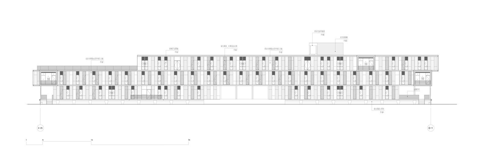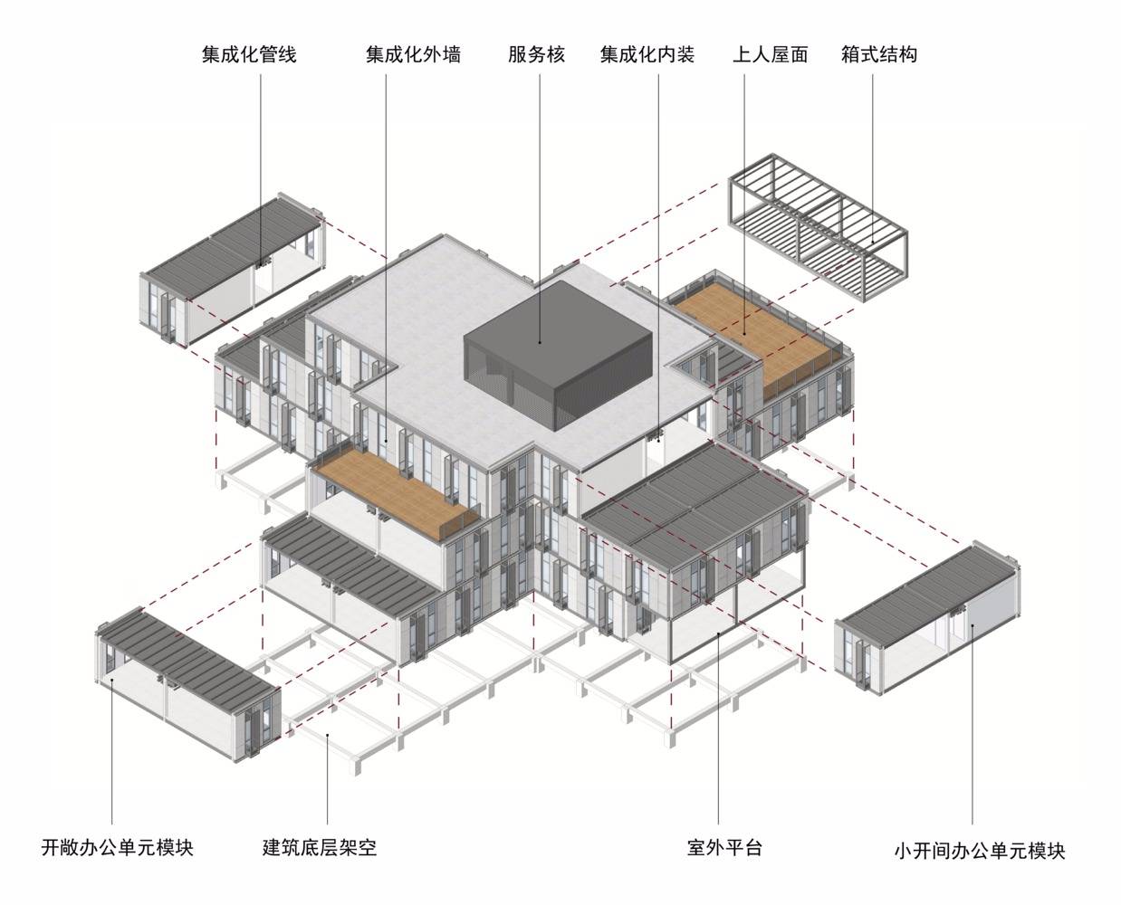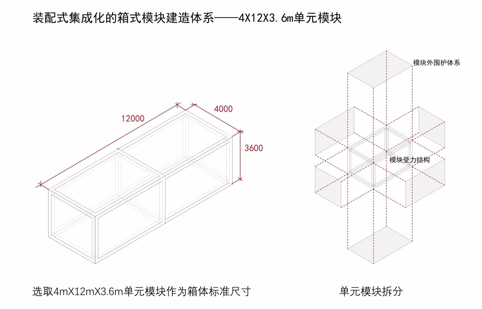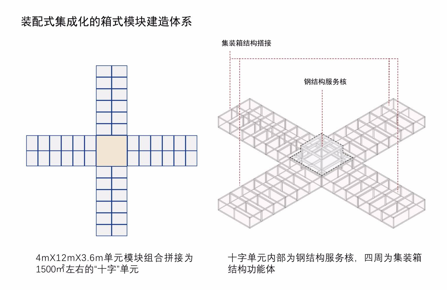 基于項目的特殊性,項目創(chuàng)新性的采用了箱式模塊化的建造體系。整組建筑由一個個12米X4米X3.6的模塊組成。每個模塊高度的集成化,結(jié)構(gòu)、設(shè)備管線、內(nèi)外裝修都在工廠加工好,現(xiàn)場只需拼裝就可完成。
