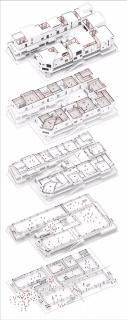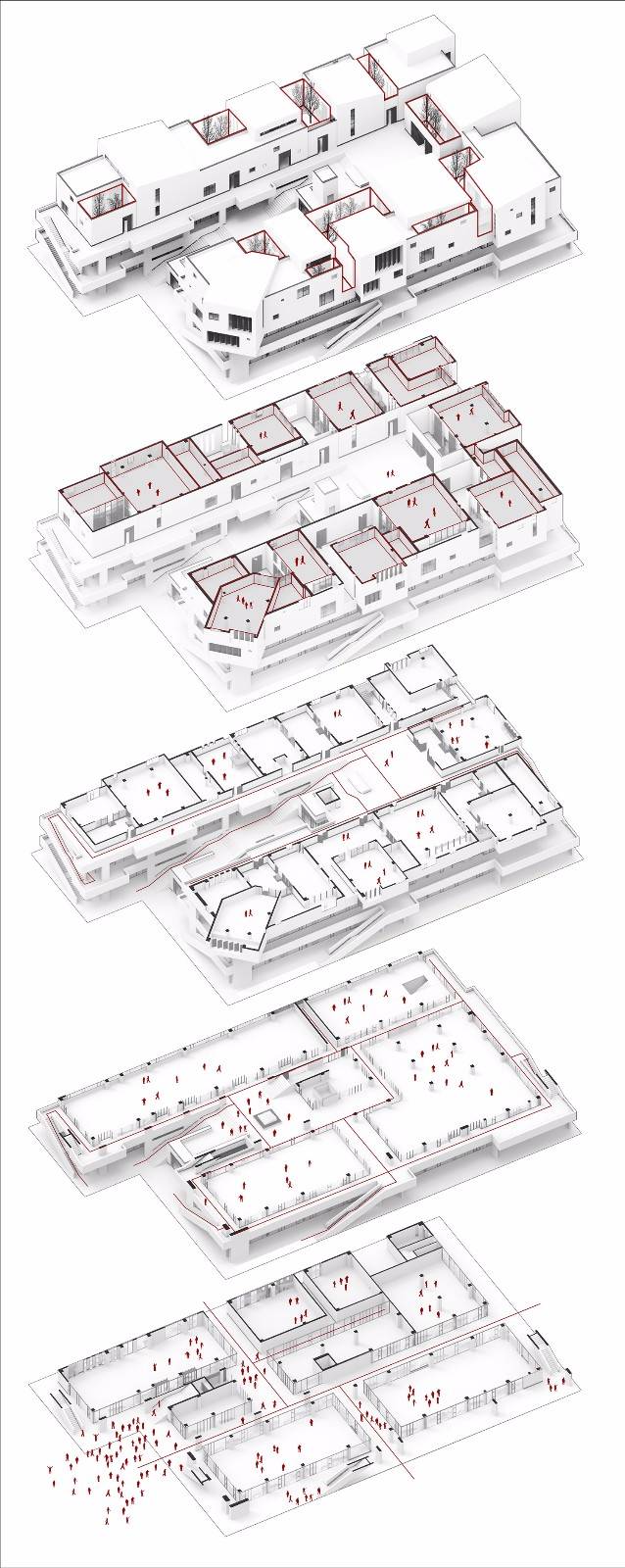空中院落的功能是小圖書室、老年人和青少年活動中心、茶室等社區(qū)活動空間。在一、二層大空間中安排了社區(qū)醫(yī)療衛(wèi)生中心、健身房、婦女之家、社區(qū)組織等機構,并通過一個回廊將所有的空間和功能串聯(lián)起來。地下一層布置了凈菜超市,方便周邊居民的日常生活。