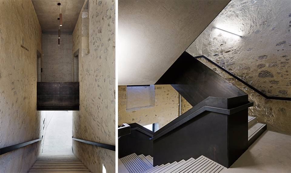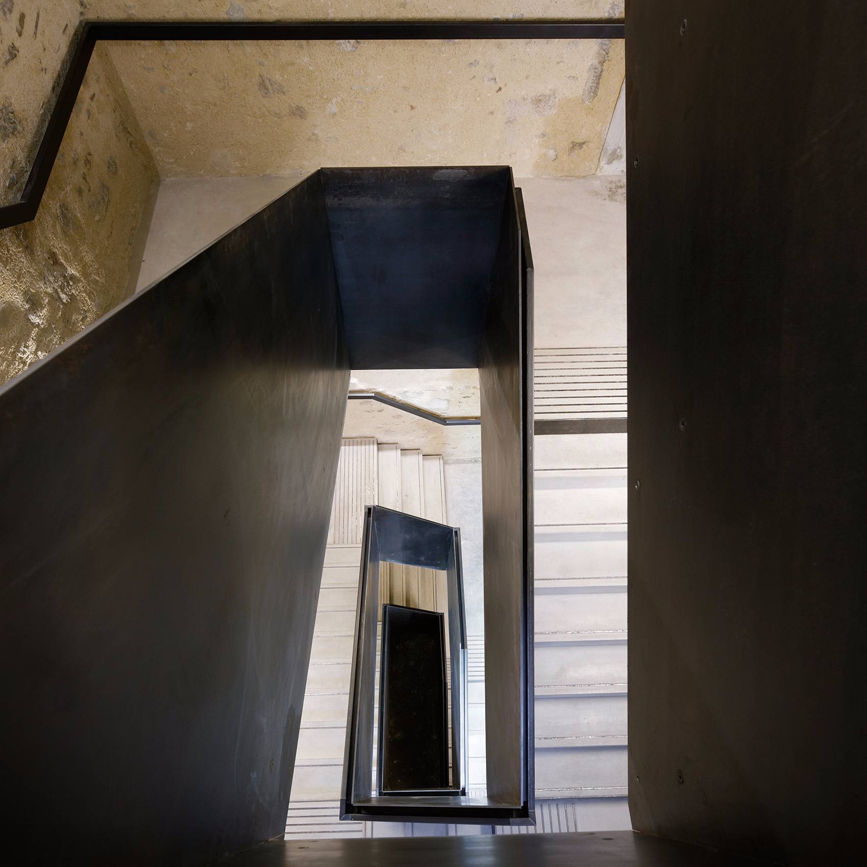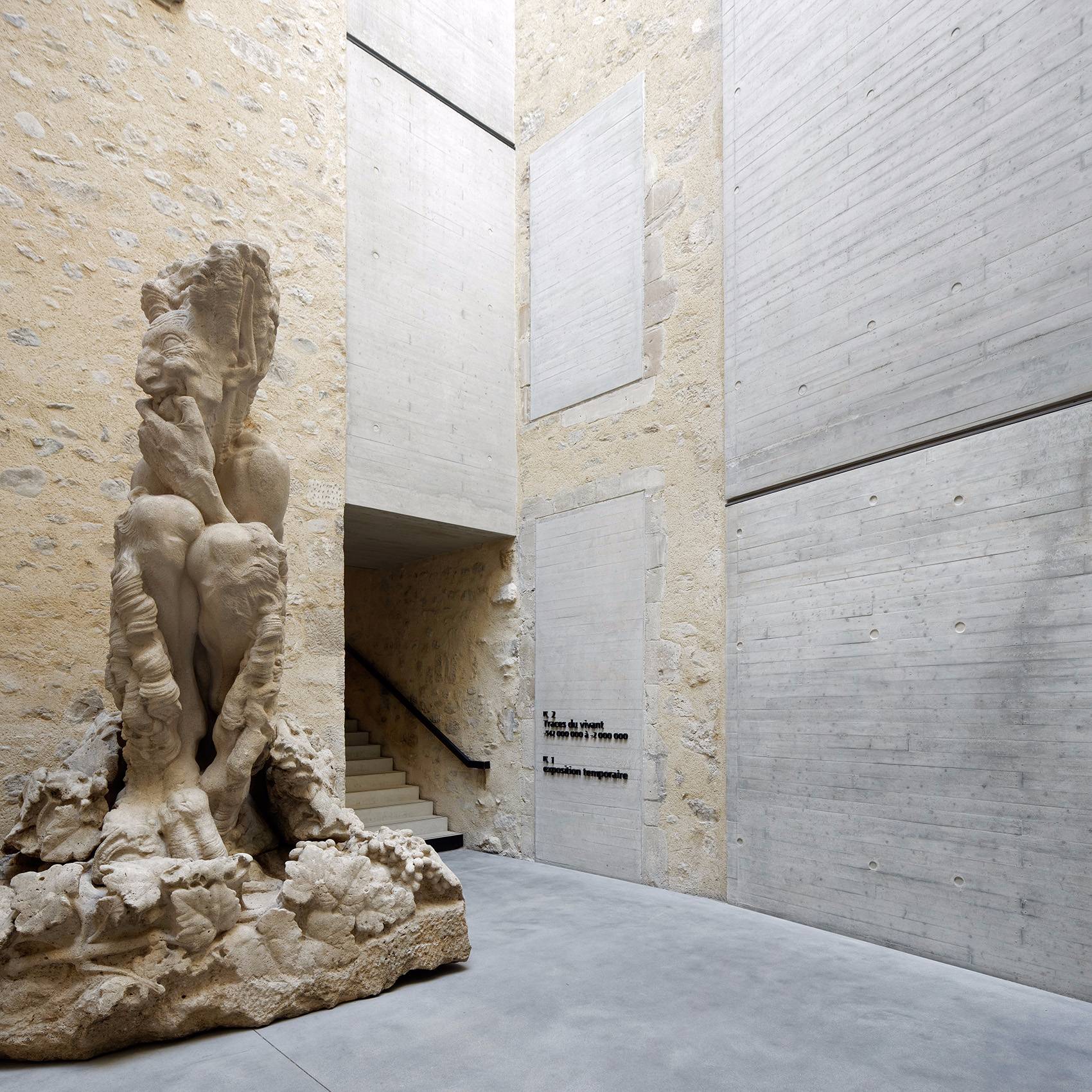 該項(xiàng)目所在的場(chǎng)地十分復(fù)雜,很難從一系列既有建筑中找到突破口。Fleury酒店大概算是其中最出挑的一座建筑。設(shè)計(jì)團(tuán)隊(duì)選擇在這里置入一個(gè)現(xiàn)代的立面,作為博物館的新入口。建筑的內(nèi)部和外部均呈現(xiàn)出天然的“礦物”質(zhì)感,從象征性和結(jié)構(gòu)兩個(gè)方面將建筑的不同時(shí)期聯(lián)系在一起。