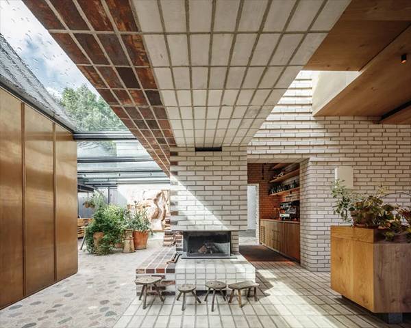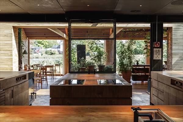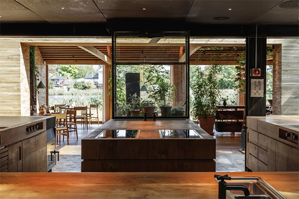 廚房周圍緊湊地排列著11個(gè)空間。獨(dú)立的玻璃房子為餐廳的花園提供食品,客人們與自然環(huán)境保持有連續(xù)不斷的聯(lián)系。