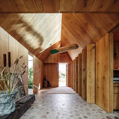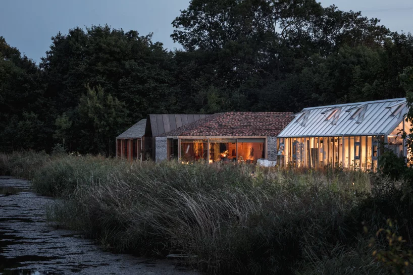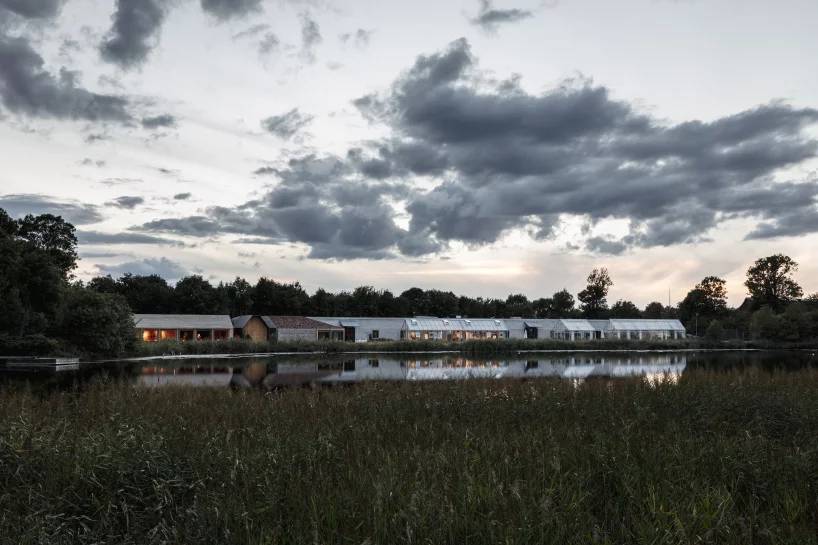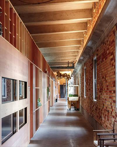 在各個(gè)建筑之間的空隙中均采用玻璃進(jìn)行圍合,使客人能夠與大自然保持綿綿不絕的聯(lián)系。長(zhǎng)100米的單層舊倉(cāng)庫(kù)使廚房周圍的建筑得到進(jìn)一步完善。事務(wù)所保留了原有建筑物上的清水混凝土外殼,并將其置入一個(gè)巨大的木質(zhì)架子內(nèi),用于存放物品和對(duì)外展示。后院所有的功能空間全部設(shè)置在這里。