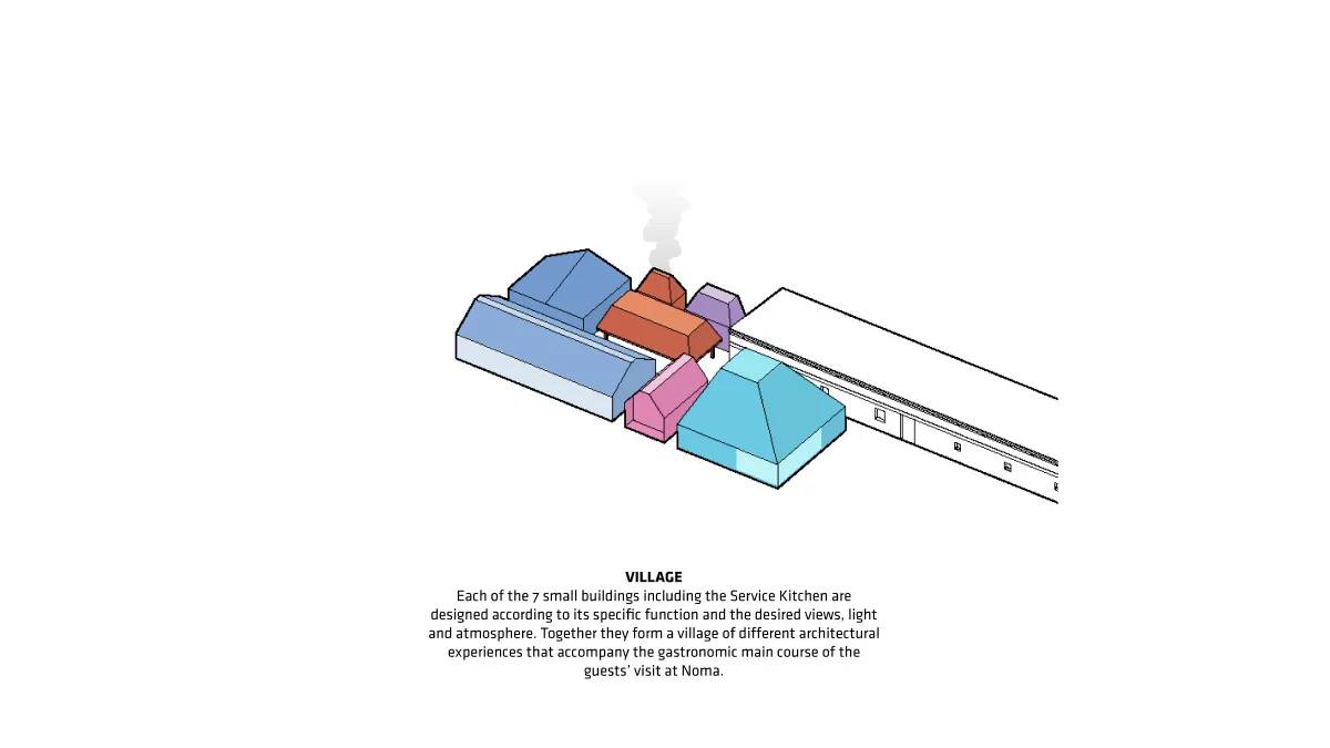 Noma餐廳作為全世界最好的餐廳之一,一直引領(lǐng)著美食與創(chuàng)意潮流。在哥本哈根,BIG建筑事務(wù)所為Noma設(shè)計(jì)了一組新的建筑體量作為其容身之所。新場(chǎng)地位于克里斯蒂尼亞社區(qū)內(nèi),建筑就建造在一個(gè)受保護(hù)的前軍用倉(cāng)庫(kù)場(chǎng)地上,該倉(cāng)庫(kù)曾經(jīng)用作丹麥皇家海軍的礦井。餐廳的構(gòu)想概念是化身一座“溫馨的花園村莊”,因此其各種功能房間被組織到一個(gè)個(gè)獨(dú)立但彼此連接的建筑物集合中,其中餐廳的室內(nèi)部分與david thulstrup工作室共同完成。