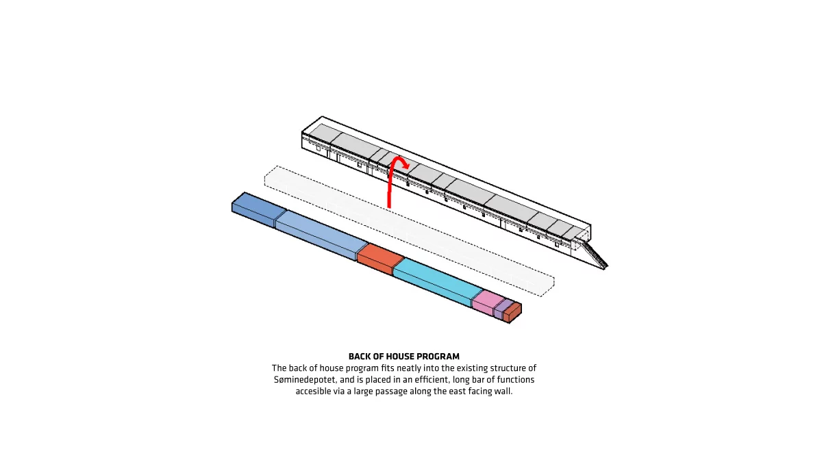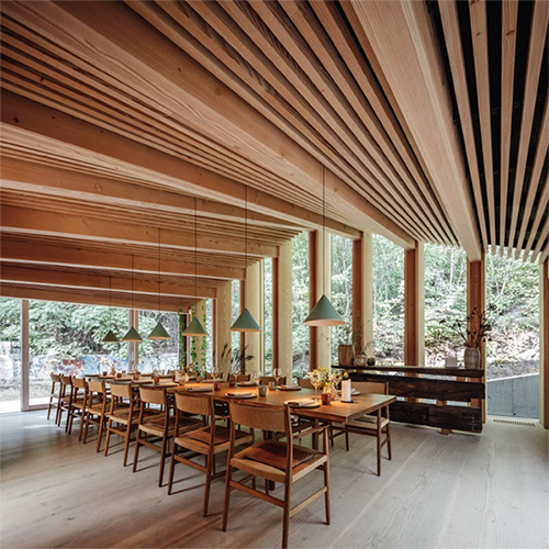 場(chǎng)地上的不同功能體量組成一系列獨(dú)立但是彼此連接的建筑集合,木料場(chǎng)里堆疊的木板好像整齊排放的木垛。