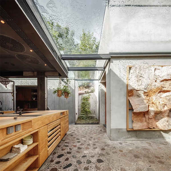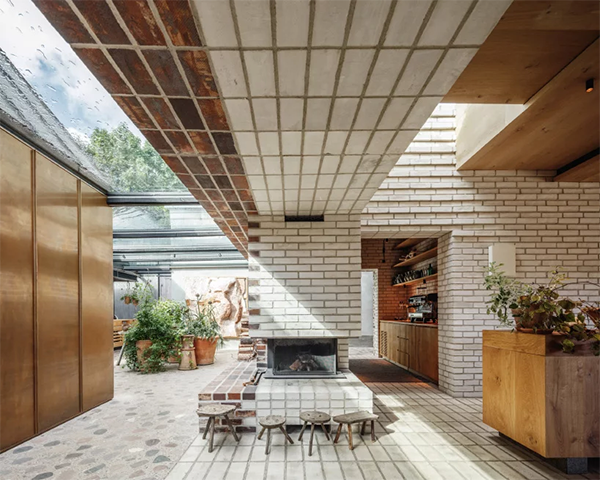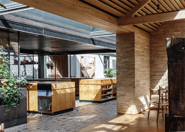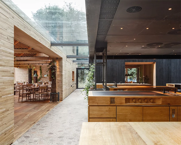 “餐廳的各個(gè)使用區(qū),比如到達(dá)區(qū)、休息室、燒烤區(qū)、品酒區(qū)和私人用餐區(qū)全部圍繞在廚房的周圍。這樣的布局方式使廚師們能夠看到餐廳的每個(gè)角落,同時(shí)也使每位客人能夠看到到那些在傳統(tǒng)餐廳中發(fā)生在‘幕后’的事情。通過(guò)玻璃覆蓋的走道將這些‘建筑中的建筑’連接起來(lái),使廚師和客人們能夠隨時(shí)感受天氣、陽(yáng)光和季節(jié)的變化,從而讓自然環(huán)境也成為美食體驗(yàn)中不可或缺的一部分?!?br/>