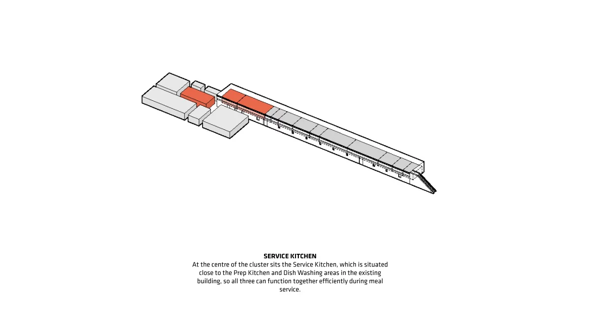 新餐廳建造在一個(gè)受保護(hù)的前軍用倉(cāng)庫(kù)場(chǎng)地上。該項(xiàng)目的設(shè)計(jì)目標(biāo)是成為一座“溫馨的花園式村莊”