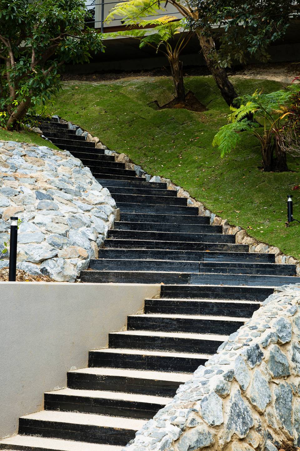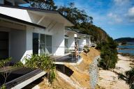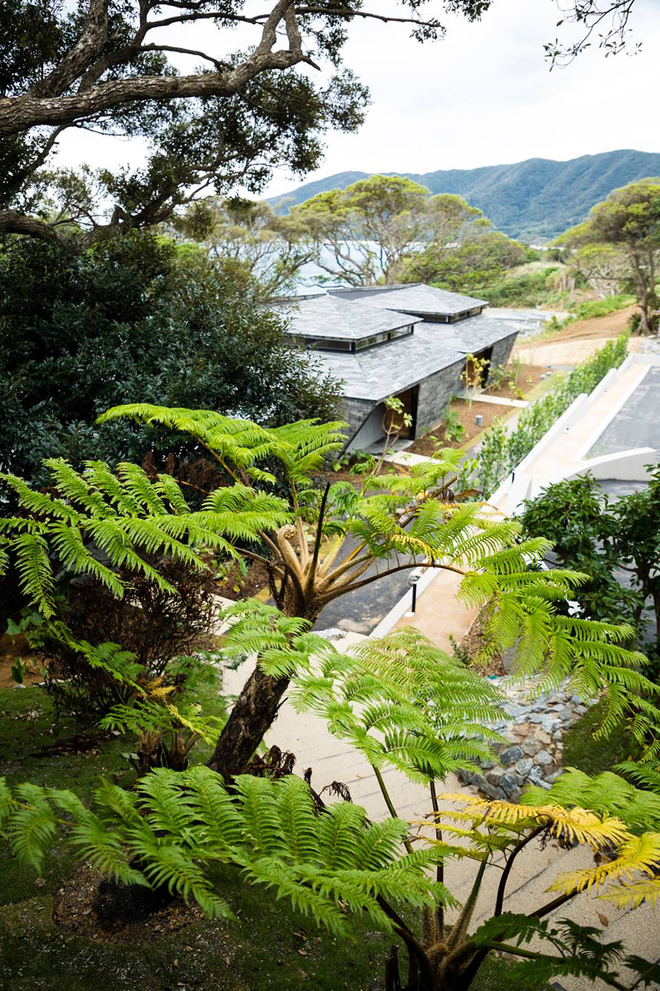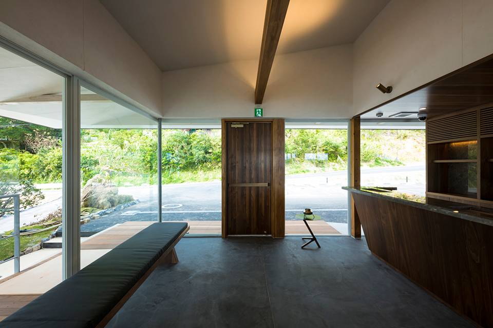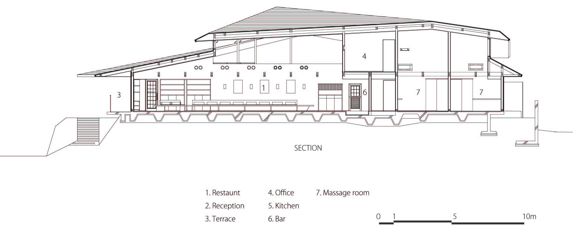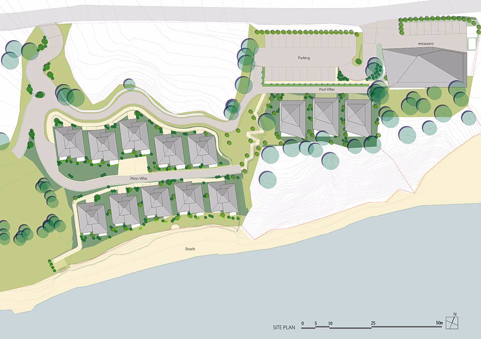 設(shè)計(jì)師為該項(xiàng)目親自探尋了符合要求的場(chǎng)地。項(xiàng)目始于2015年3月,動(dòng)工于2016年8月,最終落成于2017年11月。整個(gè)項(xiàng)目共由14棟建筑組成,包括3種不同的類型:酒店大堂和餐廳所在的行政樓、3棟豪華泳池別墅以及10棟半獨(dú)立式的別墅,合計(jì)有23間客房。傾斜的場(chǎng)地面向東南海岸,有著25米的高度差。幽靜而隱蔽的路徑順著緩緩的坡道通向風(fēng)景如畫的內(nèi)海沙灘。這種景觀的建造方式旨在恢復(fù)奄美原生態(tài)的海景,同時(shí)將建筑物嵌入周圍蔥郁的自然環(huán)境當(dāng)中。