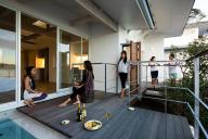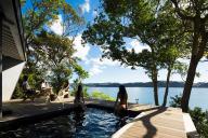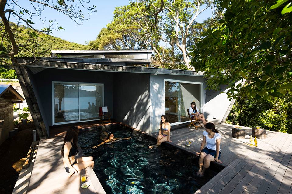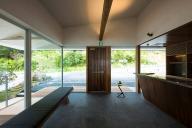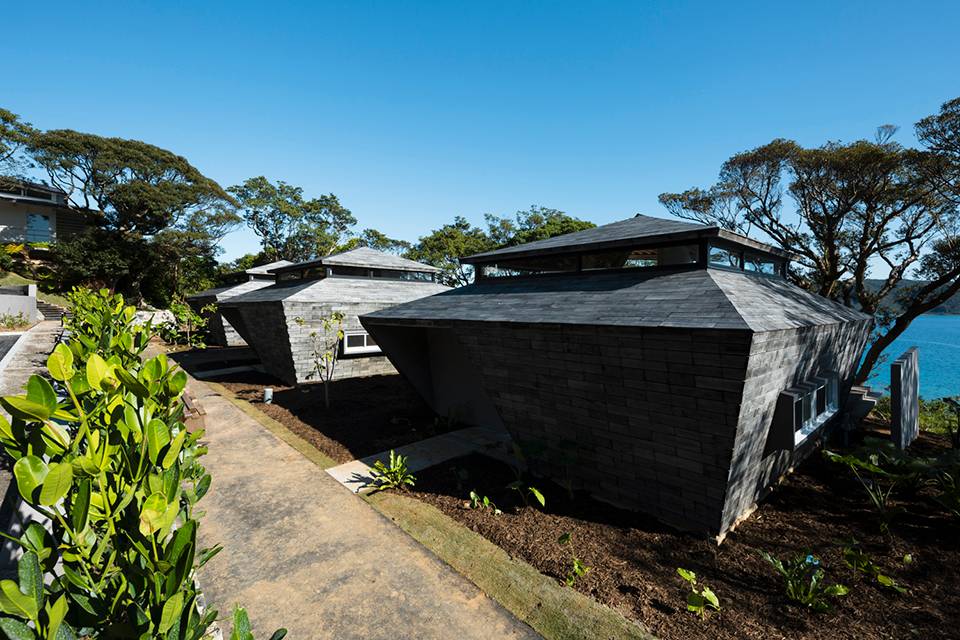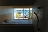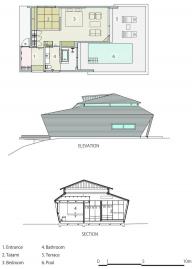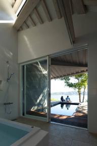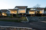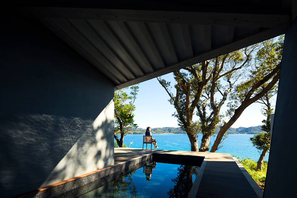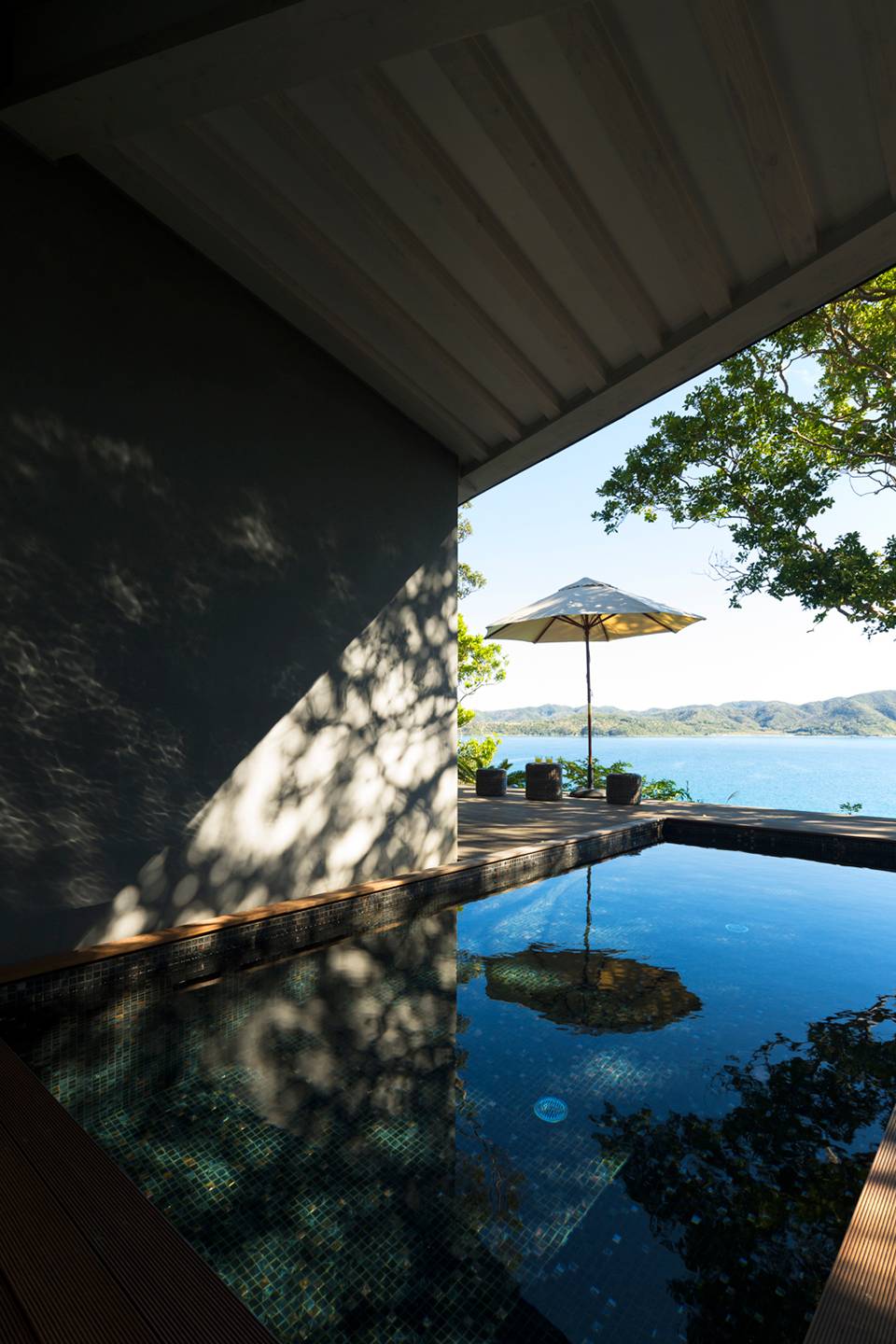 泳池別墅的設(shè)計(jì)靈感來源于奄美傳統(tǒng)的高架谷倉(cāng)、歇山頂建筑以及島上常見的海螺殼,并在結(jié)構(gòu)工程師的協(xié)助下建造而成。外墻和屋頂包覆以專為該項(xiàng)目定制的銀灰色木板。木板的處理借鑒了大島?的制作工藝:將產(chǎn)富含單寧酸的Itajii木材浸泡在島上鐵含量很高的泥漿中,會(huì)發(fā)生化學(xué)反應(yīng)使木材變成深灰色。其他建筑的屋頂也使用了同樣的材料。名為“2-Key”的半獨(dú)立式別墅采用了成對(duì)組合的、富有節(jié)奏感的錯(cuò)落式布局?!?-Key”中有一半建筑由露臺(tái)連接,可作為套房使用。