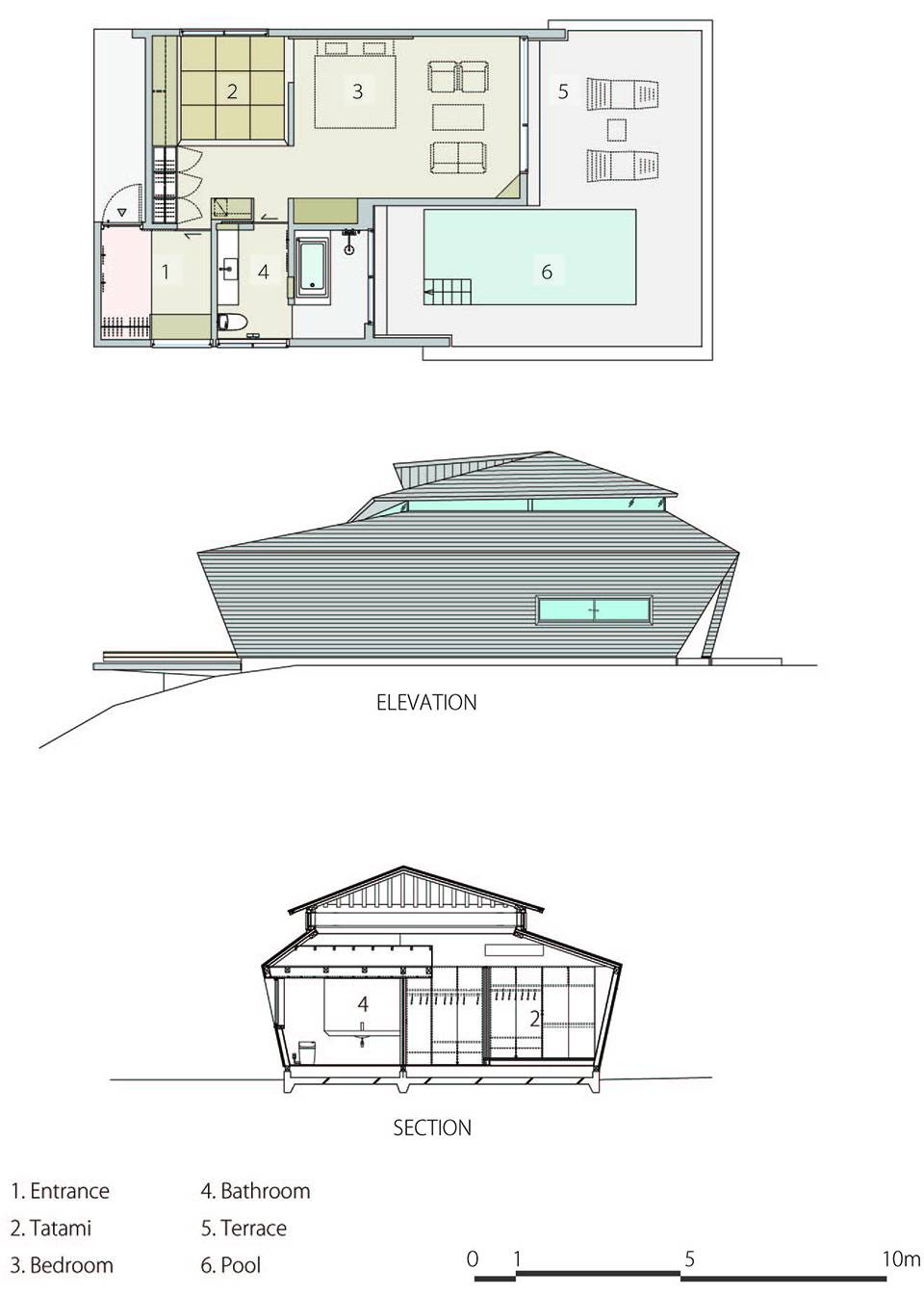 ▼泳池別墅的設(shè)計(jì)靈感來源于奄美傳統(tǒng)的高架谷倉(cāng)、歇山頂建筑以及島上常見的海螺殼