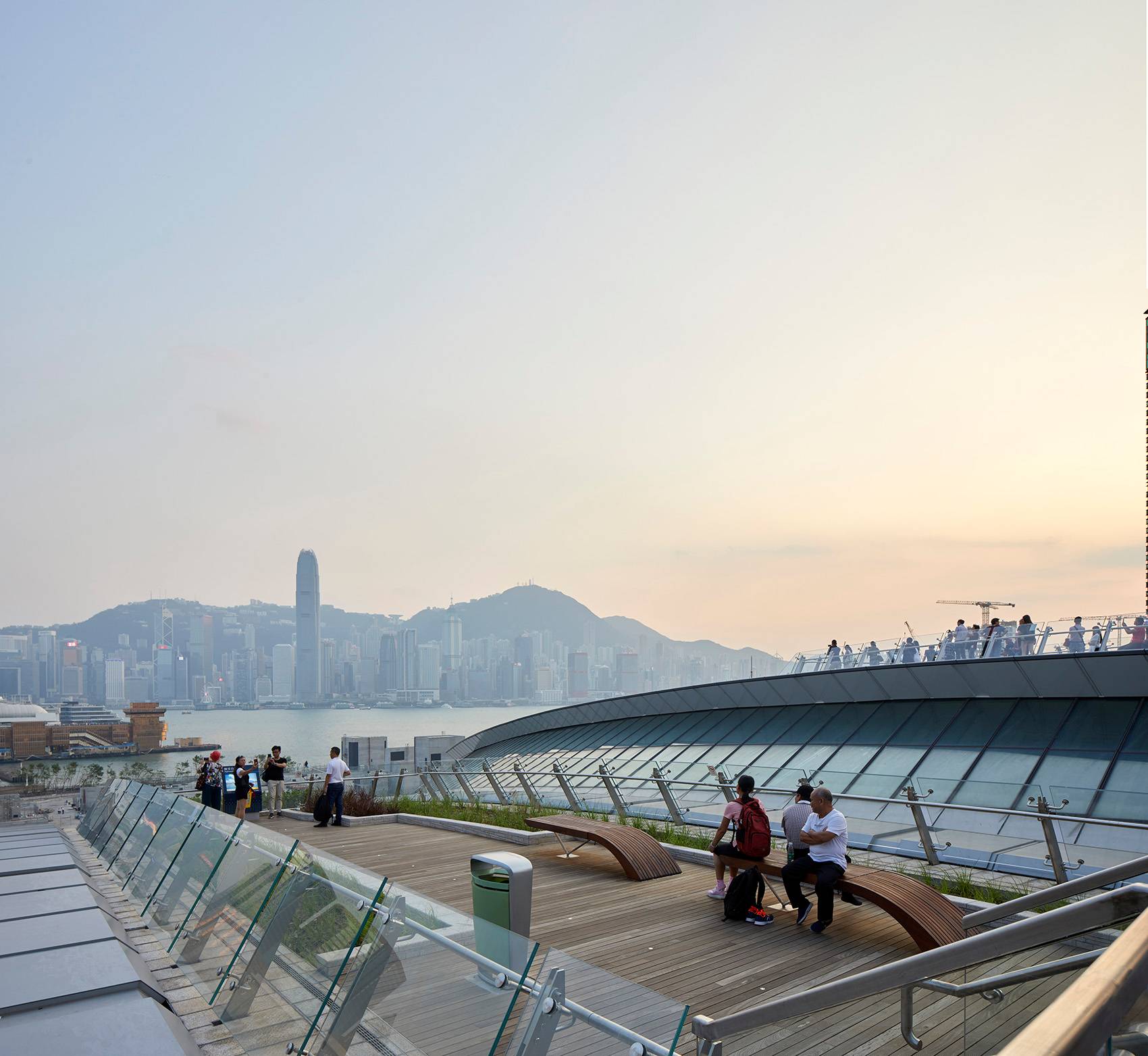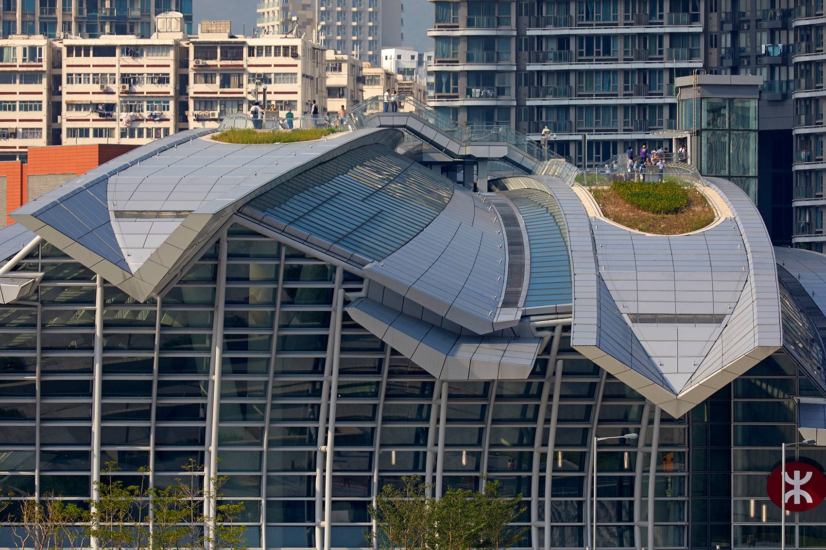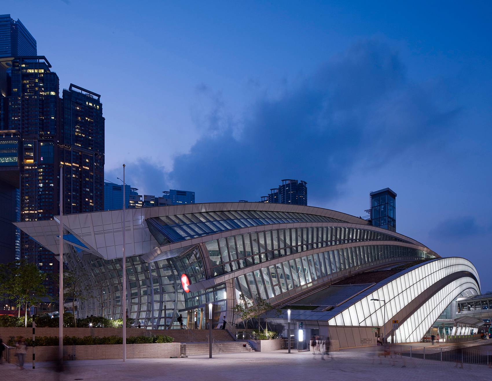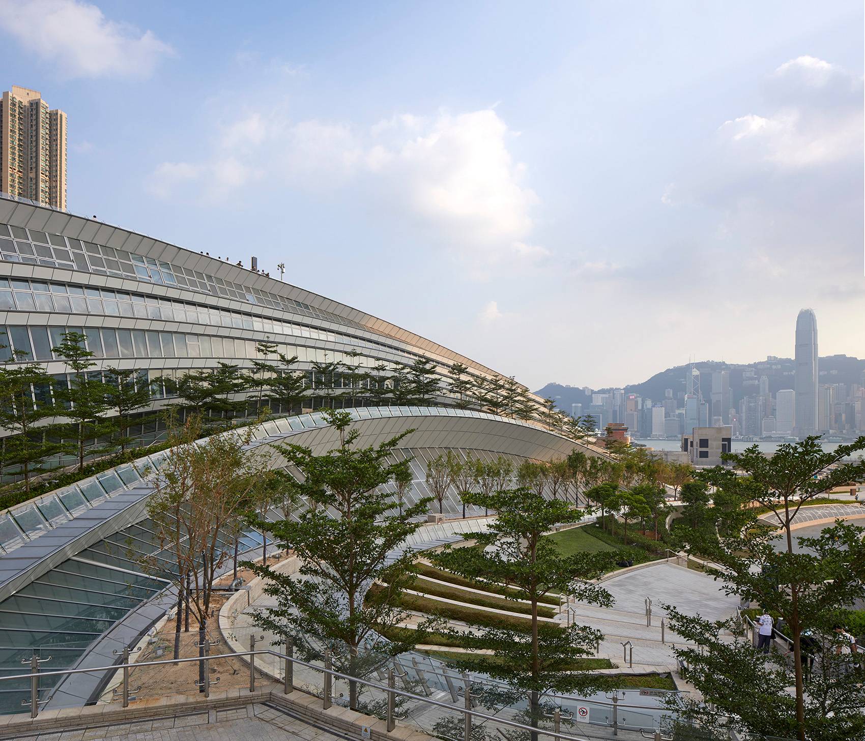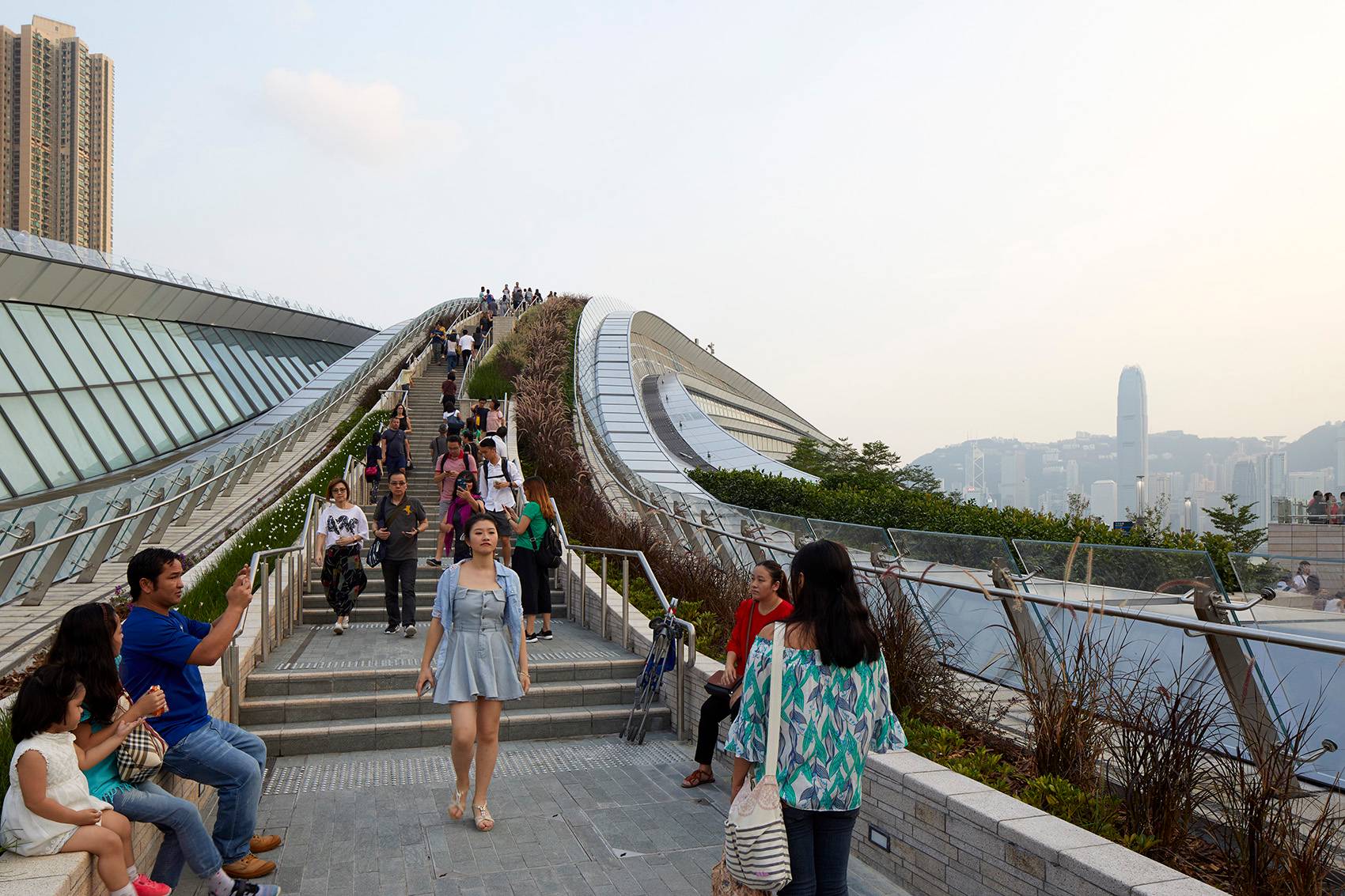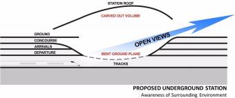 Andrew Bromberg對于該車站的設(shè)計為場地引入超過3公頃的“綠色廣場”。外側(cè)的地面層朝入口向下彎曲,而上方的屋頂結(jié)構(gòu)指向天空。由此打造出一個45米挑高的空間,將聚焦點集中于南立面,望向香港中環(huán)的天際線和太平山頂及遠(yuǎn)處。設(shè)計鼓勵并引導(dǎo)人們登上車站的屋頂,置身于郁郁蔥蔥的樹木和灌木從,享受全新的景觀,并與城市建立新的聯(lián)系。