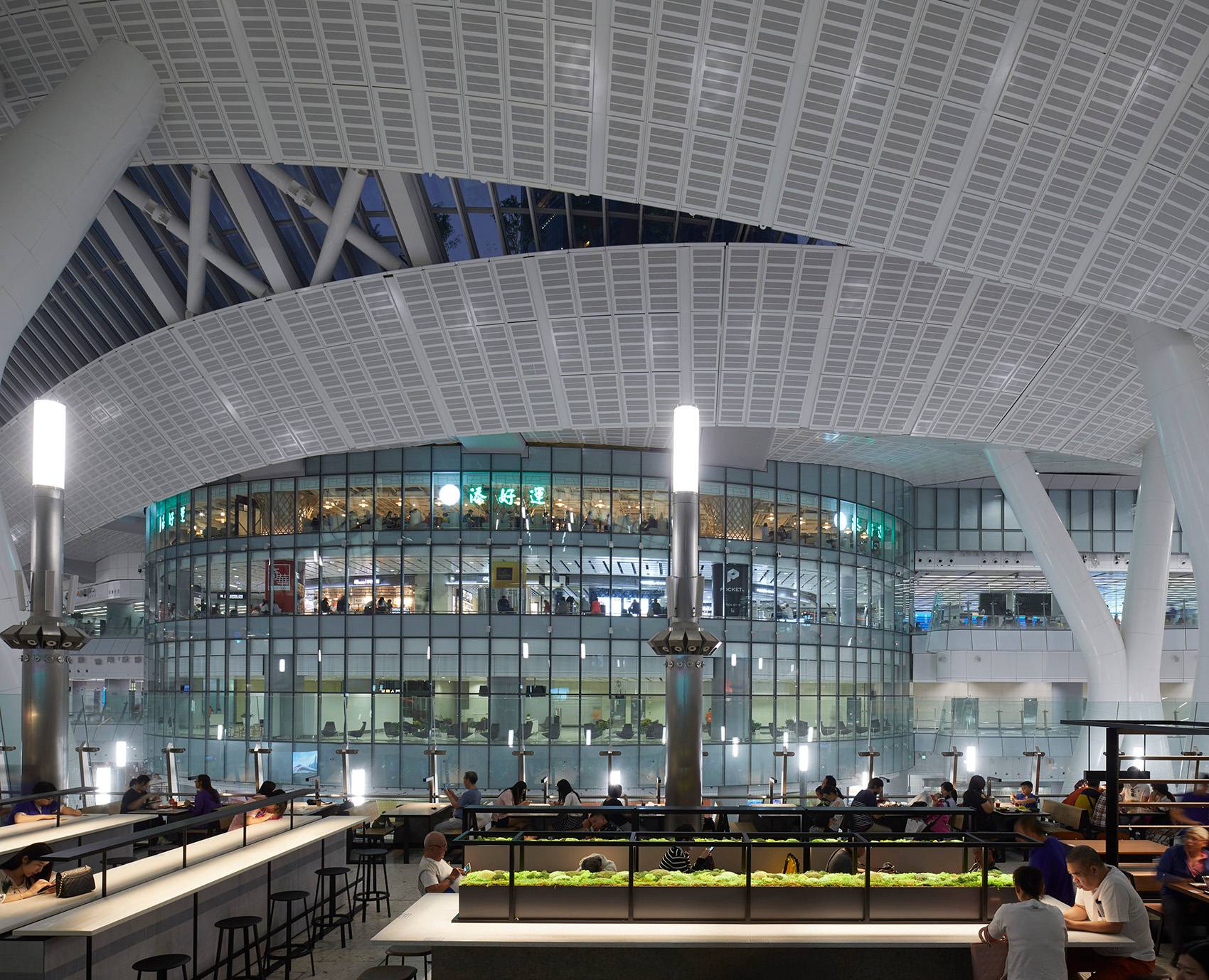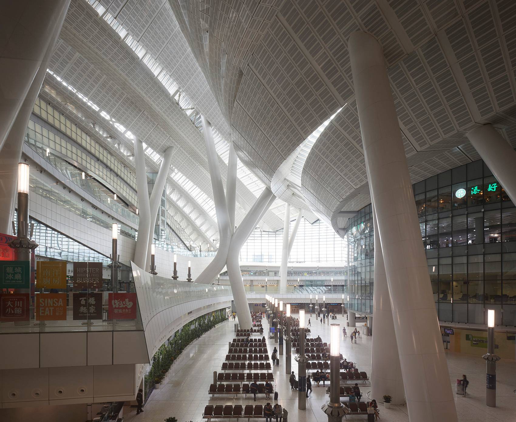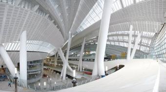 大廳的內(nèi)部仿佛一片森林,傾斜的鋼柱支撐著巨大的仿佛懸浮在空中的屋頂,架置4,000塊玻璃面板,將自然光線帶入建筑內(nèi)部,同時讓人們甚至從車站的下層也可以看到外面的城市景色。對于香港這座垂直城市而言,Bromberg的車站設(shè)計緊貼地面,令人耳目一新。建筑師熱切地使建筑體現(xiàn)出流動感,以反映這座國際化城市融合各種力量的理念。香港西九龍站的開放性和以人為本的包容性設(shè)計,將為這座城市光明而激動人心的未來奠定基礎(chǔ)。