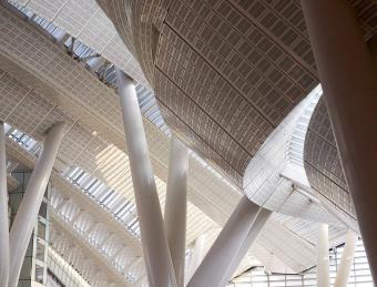 ▼傾斜的鋼柱支撐著屋頂,4,000塊玻璃面板將自然光線帶入建筑內(nèi)部