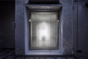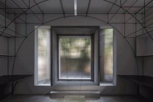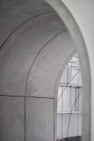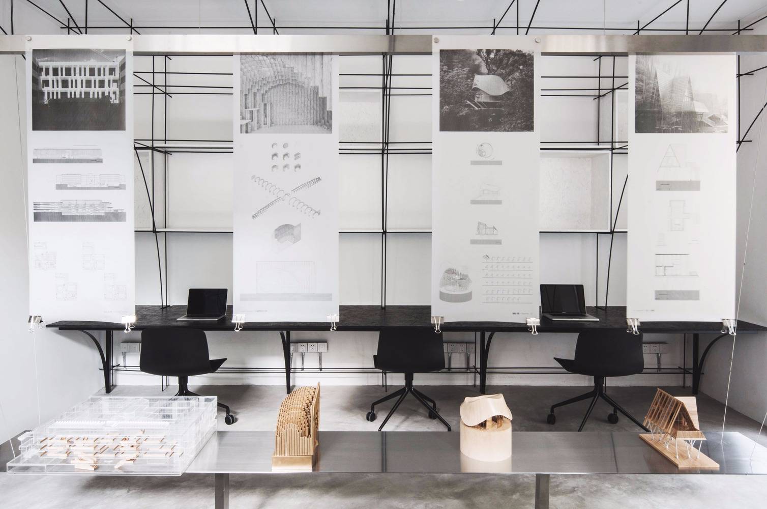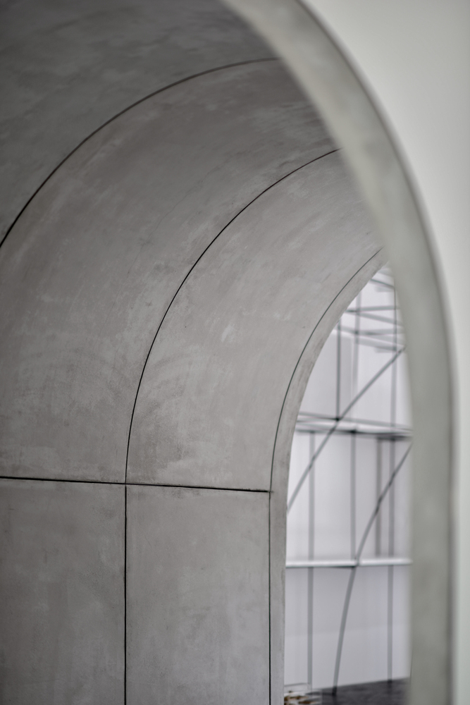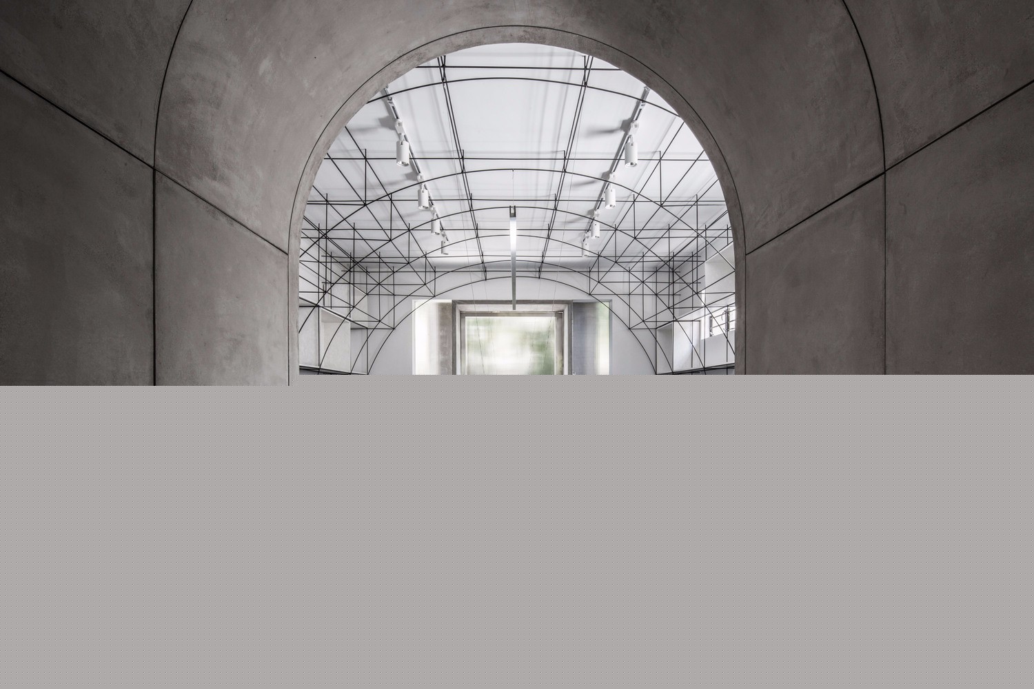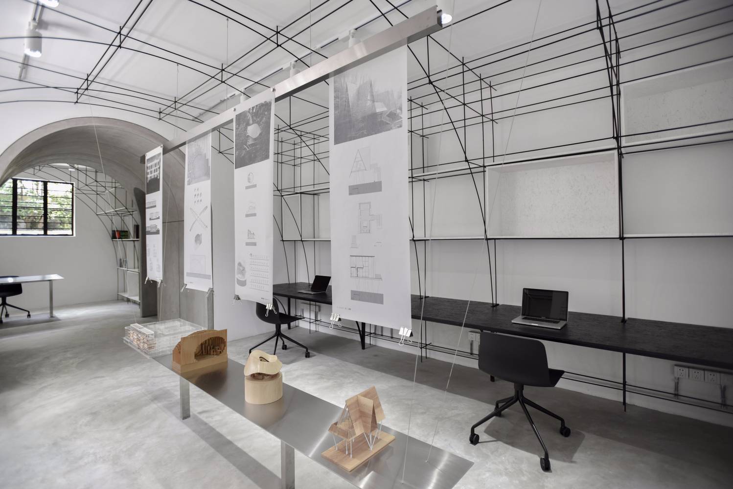 在材料的選擇上我們關注的是材料對空間的塑造能力和對空間的復合利用能力。黑色螺紋鋼的可塑性勾勒出拱的形態(tài),鋼材與磁石的結合使展覽可以布滿整個空間;辦公室入口,評圖廊道和轉換廊道這些穿越式空間使用清水混凝土,它的厚重使這幾處空間獲得了我們鐘愛的儀式性;我們把空調,服務器等服務空間隱匿于評圖廊道背后,清水混凝土具有的隔音性能,使辦公室獲得了更安靜的效果。拉絲不銹鋼的可被精確塑造的能力和微弱的反射能力,使構造細節(jié)得到了保證,也使拱形獲得了某種形式上的拓展。