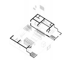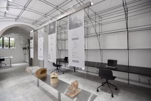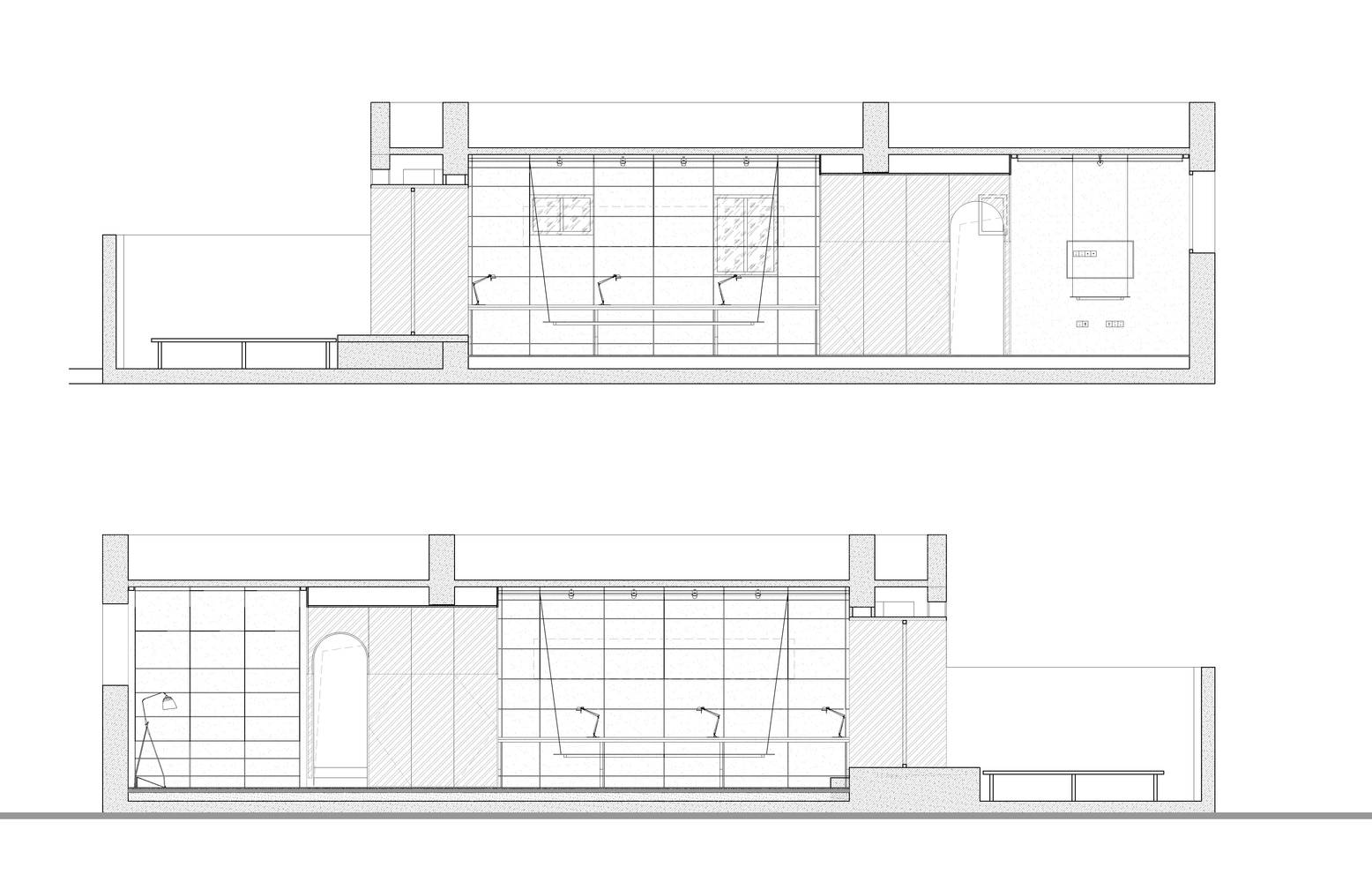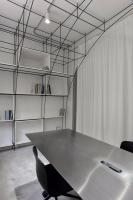 我們需要在這小型空間創(chuàng)造出8人的工作空間以及與建筑相關的展示空間需求。我們第一步是精簡,剔除居住功能;第二步是復合,我們在主要辦公區(qū)的中部植入展覽空間,以滿足不定期小型展覽的需求;通往會議室的過道加寬形成為評圖區(qū)域;會議室與小型圖書館混為一室;原有衛(wèi)生間和淋浴的隔墻被打開,轉換為模型室,材料室和打印室,這三者與廚房用餐空間連通,模型室的桌面和廚房臺面等高,使兩者可以互相擴展。