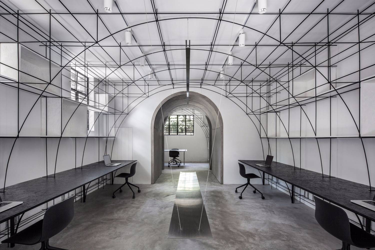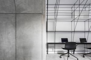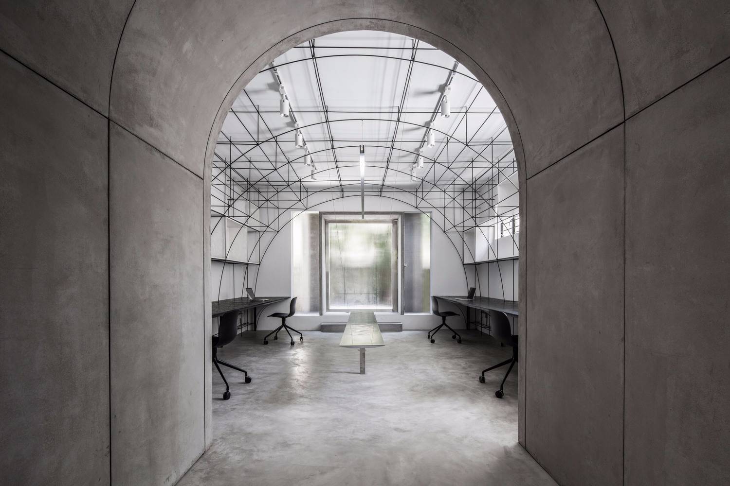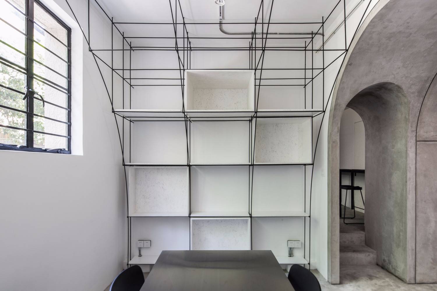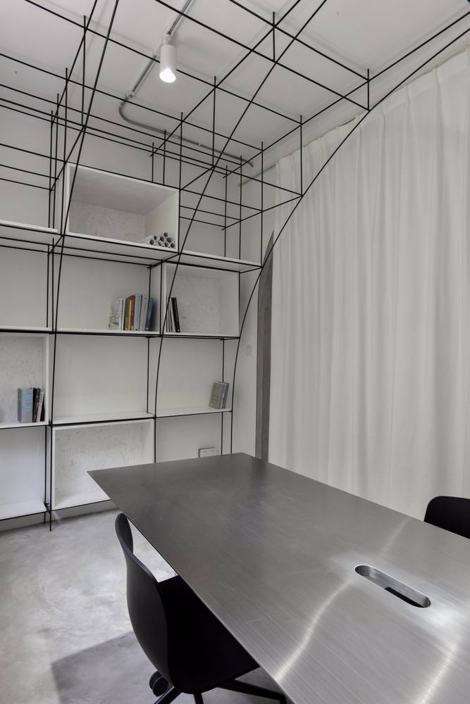 無腿的辦公桌,懸浮的拉絲不銹鋼桌面,彎折成拱形的鋼筋,這些對建筑材料的反復探索,是建立在小型空間使用性的研究之上的,避免建筑材料淪為室內的裝飾,我們考慮如何利用材料的物理特性構造功能和空間,例如鋼筋不僅勾勒的是拱的形態(tài),同時又是儲物空間,也是展覽空間。所以這個辦公室不止于我們的辦公空間,也是我們對自己設計理念和哲學的實驗。