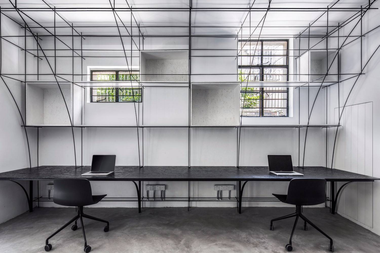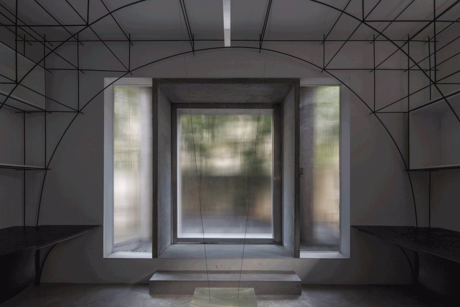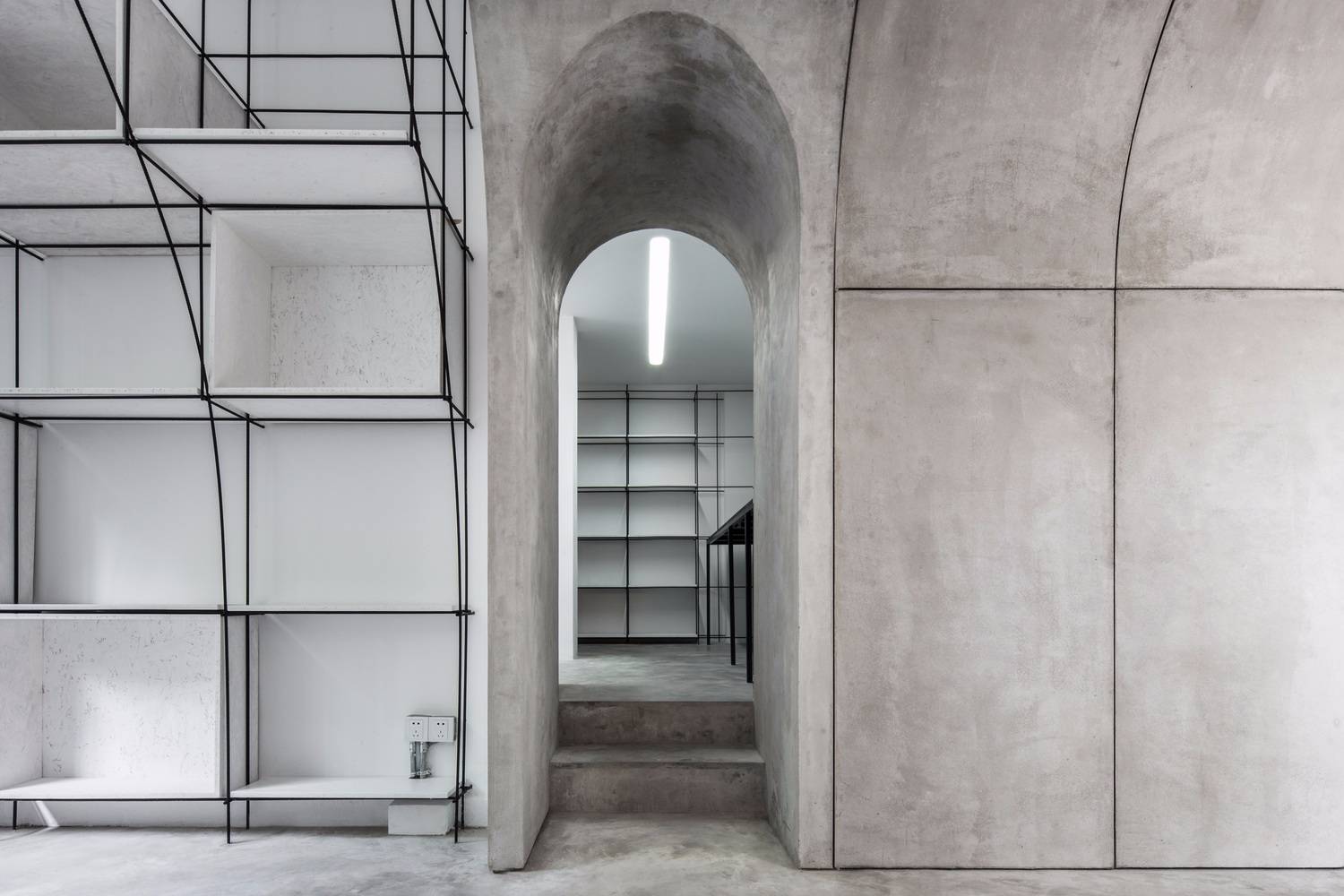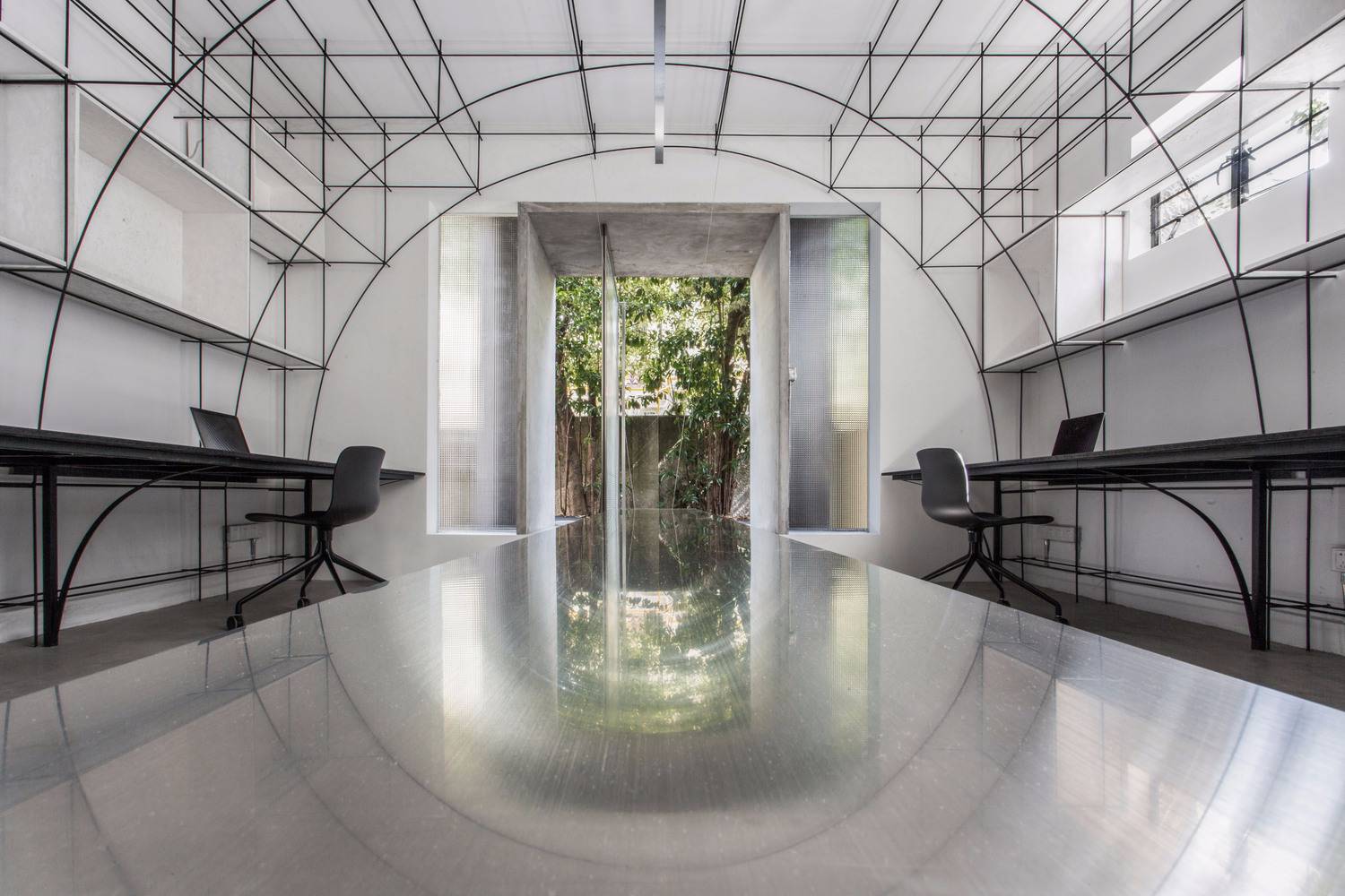 無腿的辦公桌,懸浮的拉絲不銹鋼桌面,彎折成拱形的鋼筋,這些對建筑材料的反復探索,是建立在小型空間使用性的研究之上的,避免建筑材料淪為室內的裝飾,我們考慮如何利用材料的物理特性構造功能和空間,例如鋼筋不僅勾勒的是拱的形態(tài),同時又是儲物空間,也是展覽空間。所以這個辦公室不止于我們的辦公空間,也是我們對自己設計理念和哲學的實驗。