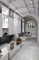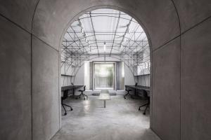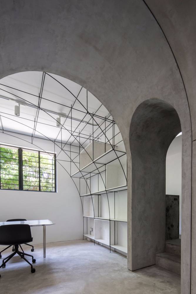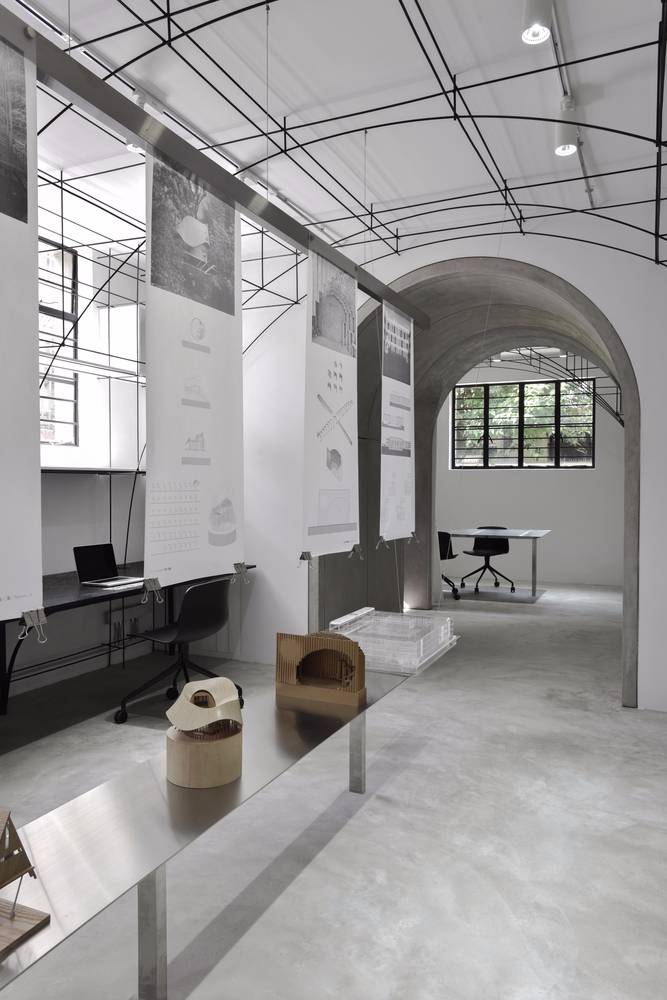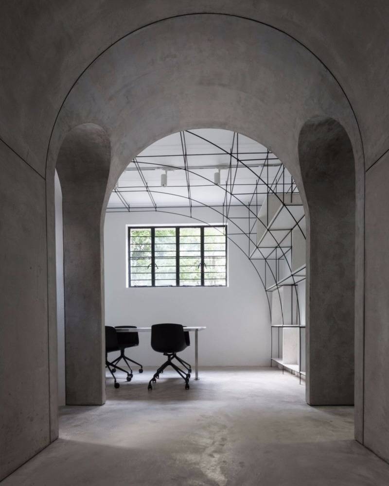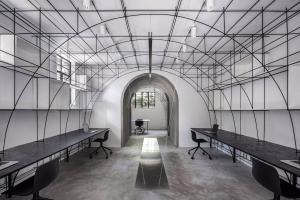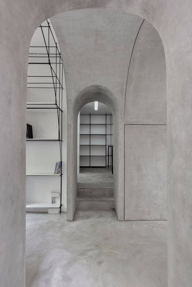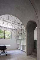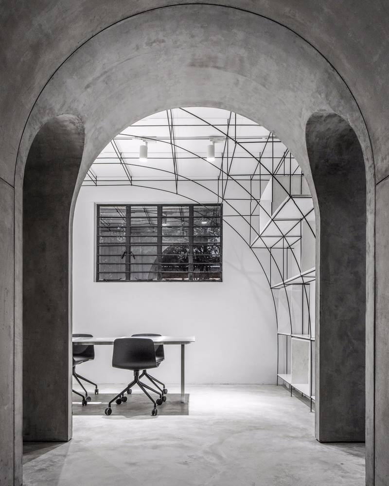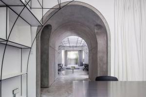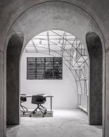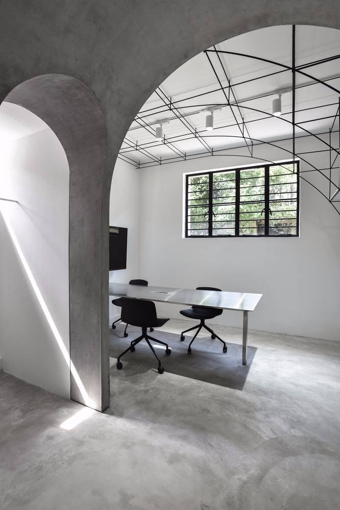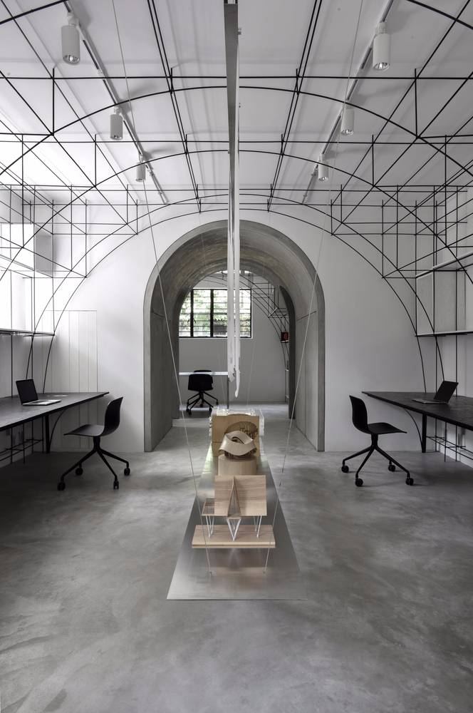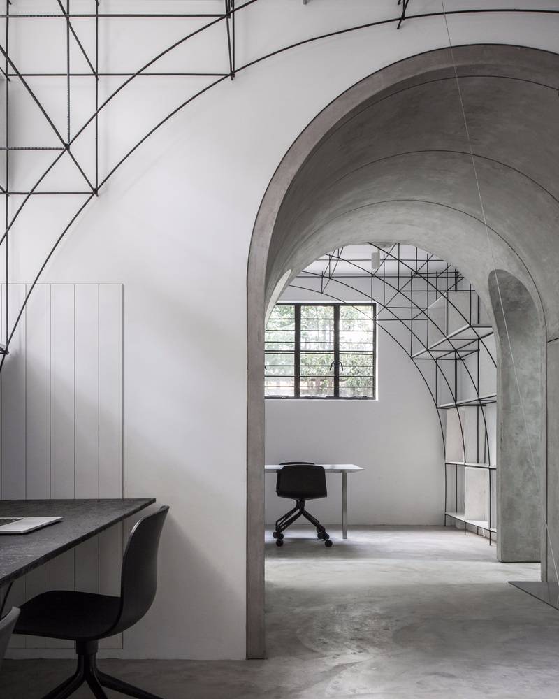 我們在室內空間的形式處理上采用了拱形,這一方面是對本街區(qū)內上海老法租界的最具特色的拱廊和拱門的一種致敬。不同尺度的拱形界定出了不同的空間,大拱頂?shù)墓ぷ骺臻g,半拱頂?shù)臅h室,以及不同功能空間之間作為過渡的小型拱廊,比如評圖廊道,以及另兩個拱形過廊。另一方面,拱形也對原有建筑格局進行了包裹和保護;再者,拱形的形式特點使得在人頭頂之上的空間被巧妙利用,開發(fā)了更多的儲藏空間和多用途空間。