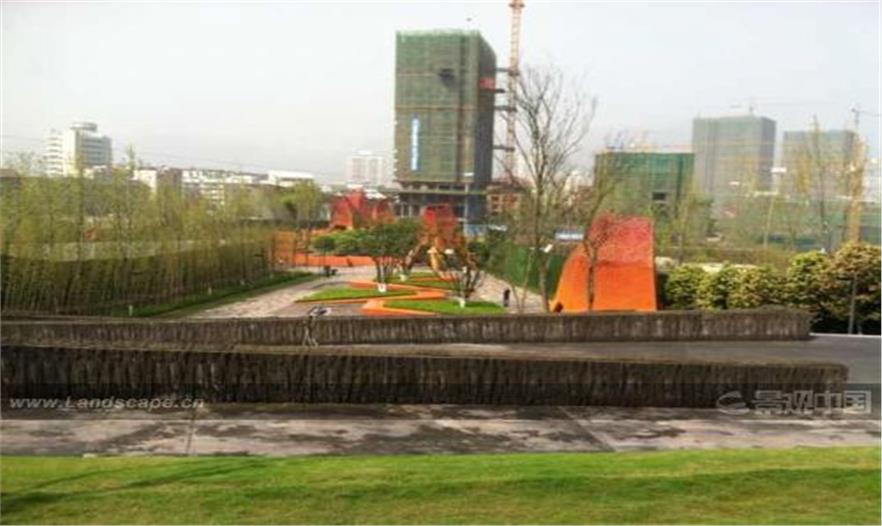 示范區(qū)景觀充滿了瑪莎•舒瓦茨具有代表性的“藝術(shù)”氣息,整個示范區(qū)構(gòu)圖由折線形的線條一氣呵成,包含了橘紅色的景觀裝置物、折線形的地面鋪裝和擋墻以及與之相互呼應(yīng)的人工溪流。不論從設(shè)計概念、線型結(jié)構(gòu)和空間氛圍營造上,都屬于上乘作品,足具參考價值。
