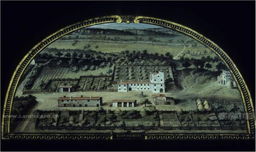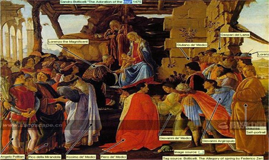 14~16世紀,美迪奇家族(The Medici family)是意大利最有權(quán)勢的家族。由著名畫家波提切利1475年所繪的《三博士來朝》(Adoration of the Magi) (圖4)就表現(xiàn)了這一家族。美迪奇家族在佛羅倫薩很有權(quán)威,他們在城市擁有宮殿,在托斯卡納 (Tuscan)郊外擁有別墅。別墅的裝飾畫(圖5)足以證明當時的觀點,即生產(chǎn)性景觀是財富的源泉,同時也是美麗的象征。隨著時間演變,生產(chǎn)性景觀是美麗的景觀這一理念被大家所共識,并且現(xiàn)在依然是世界景觀視覺評價中非常重要的因素。