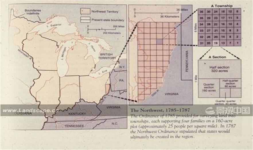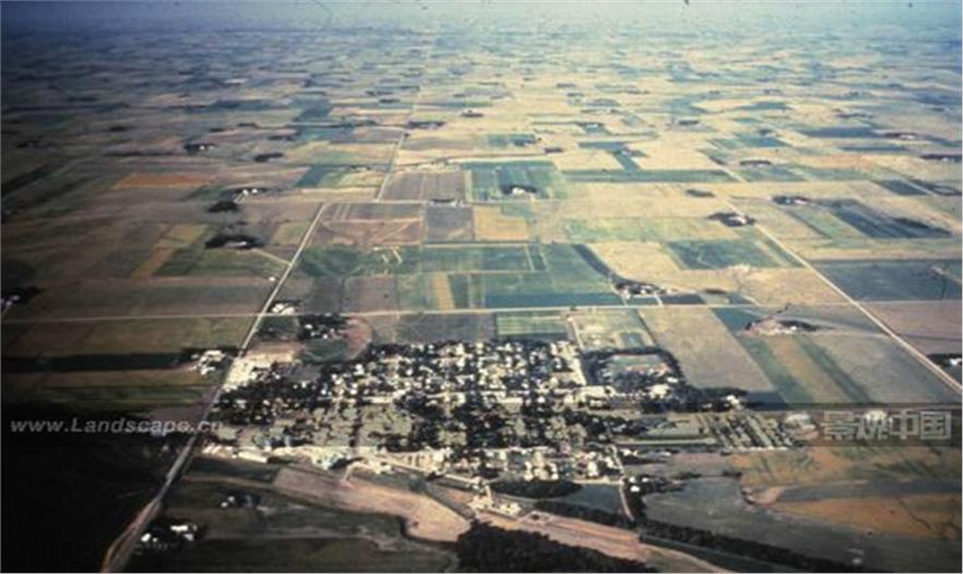 托馬斯•杰克遜(Thomas Jefferson)是美國第三任總統(tǒng),當時他決定在美國西北部地區(qū)利用方格網(wǎng)的形式進行測量和細劃,目的是希望通過方格網(wǎng)形式來使區(qū)域清晰化以鼓勵大家在此定居(圖6)。他認為這是一個非常簡易的方式,這種決定用測量的方式來進行規(guī)劃也影響了美國的其他地區(qū)。今天我們坐飛機飛過美國上空的時候,都會看到這樣一種景觀(圖7),杰克遜總統(tǒng)對美國景觀的成形貢獻非常大。然而,他并不是歷史上第一個用這種理念來做規(guī)劃的人。在羅馬帝國時期,常常用方形的農(nóng)田以獎勵那些立下戰(zhàn)功的士兵們。