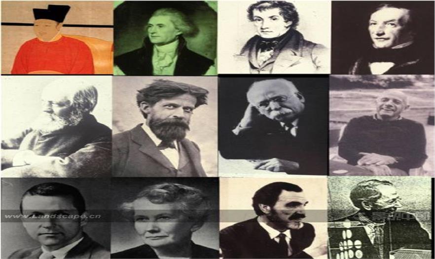 Carl Steinitz:大家早上好!我并不是一個歷史學家,我是一個對區(qū)域的重大景觀改變有興趣的景觀規(guī)劃師,同時我也對一些新的理念非常有興趣,但我知道那些對我的項目有過影響的理念,有些可能是比較陳舊的理念。在這個講座中,我將對大約30位對核心理念產(chǎn)生重要影響的人進行概述(圖1)。這些人的理念對我本人以及眾多從事大規(guī)模區(qū)域景觀規(guī)劃的人都有巨大的影響。這些人中,每個人都做了大量的復(fù)雜的研究,我將每位的思想進行歸納,將之總結(jié)為1~2個非常重要的理念。他們當中并不全是設(shè)計師,有的是科學家、有帝王及政府官員,還有銀行職員。同時我也會講一些我年輕時候曾經(jīng)參與過的項目。這些項目中,我向先人學習了很多。