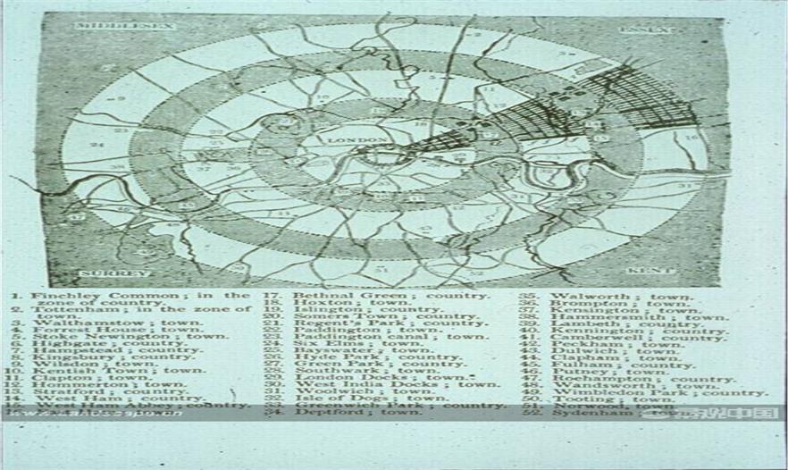 約翰•克勞迪斯•路登(John Claudius Loudon)在19世紀30年代是英國最重要的園藝師。他以替有錢人設(shè)計花園而出名,同時他也是一個著名的景觀、園藝家和思想家。 路登有個重要的思想,他為整個大倫敦區(qū)作了一個區(qū)域景觀規(guī)劃。規(guī)劃建議以泰晤士河邊的維斯敏斯宮為圓心,四周是交替的都市和郊區(qū)環(huán)帶。路登作了一系列的設(shè)計來證明城市中心、近郊區(qū)和郊區(qū)花園的不同之處。這種同心圓的布局方式體現(xiàn)了他的一個觀點,即人們不能總是生活在城市或總是生活在郊區(qū)中,城市與郊區(qū)對人來說都是非常重要的。說地更清楚些,沒有鄉(xiāng)村的話,我們城市是沒有辦法生存的,我們城市不會有水源和食物。在19世紀30年代,這是一個重要的思想,即使在今天,這個思想對大城市而言仍然具有借鑒意義。圖10中離心圓圖表為了表達人類不能僅僅生活在農(nóng)村或者僅僅生活在城市,這兩者應(yīng)該是融合的。城市和鄉(xiāng)村融合共生的理念,在當時是非常有突破性的,而且今天也是非常重要的。