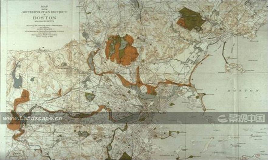 查爾斯•艾略特(Charles Eliot)是波士頓非常著名的景觀設(shè)計師。19世紀90年代末期,波士頓的市民意識到其他城市正在建立非常重要的公園系統(tǒng)。但波士頓是一個老城市,建成區(qū)域很多,空地極少。因此艾略特想在波士頓的閑置土地上構(gòu)建開放空間。他當時很有權(quán)勢和影響力,他組織民眾征用濕地、陡坡、崎嶇山地、污染地區(qū)等沒有人要的土地,并號召大家把這些土地規(guī)劃為公園系統(tǒng)(圖15)。眾人花了很多時間來做這件事情,包括奧姆斯特德也在其中。最終將這些土地設(shè)計成了引人入勝的休閑娛樂公園。如今,當你看波士頓的公園系統(tǒng)時,會覺得這和其他城市沒有什么區(qū)別,但值得記住的是這些公園是在廢棄的土地上建立的。艾略特的偉大思想在于他提出要控制土地,直到將來將其轉(zhuǎn)變?yōu)橛杏弥亍?/p>