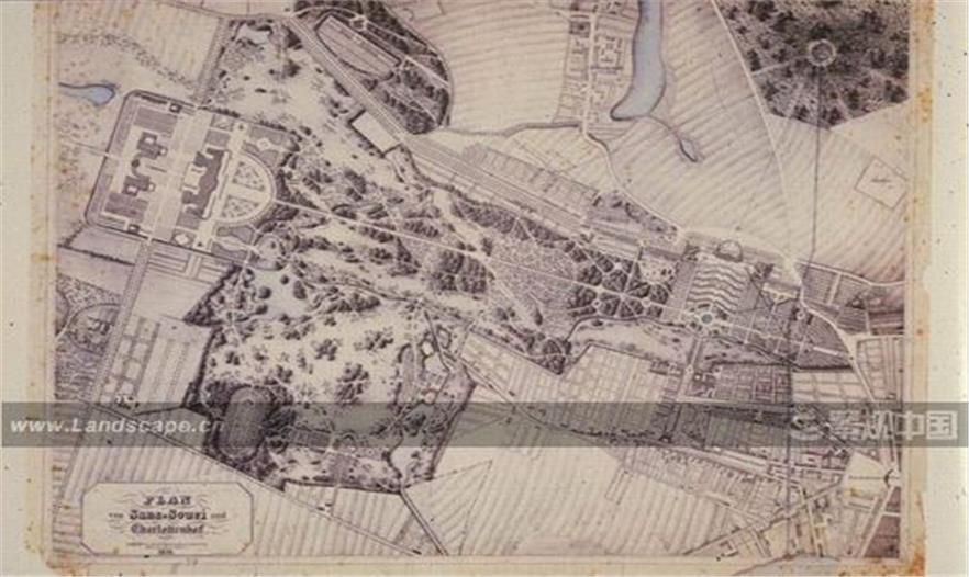 彼得•約瑟夫•林內(nèi)(Peter Joseph Lenne)無疑是德國最著名的景觀設(shè)計師。他曾說過:任何東西缺少照料就會衰敗,即便是最偉大的設(shè)計,如果處置不當,也會被破壞。就是說我們不能在一個設(shè)計剛建完之后,拍張照片就完了,我們需要一個精細的維護計劃。林內(nèi)的職業(yè)生涯伴隨著從皇權(quán)到民主的革命時代。他最著名的項目在柏林的波茨坦(Potsdam),那里是當時皇帝建立宮殿的地方。波茨坦皇宮是由建筑師申克爾(Karl Friedrich Schinkel)和其他設(shè)計師共同設(shè)計,但林內(nèi)在他們建筑設(shè)計之前,就確立了整個景觀格局(圖11)。他最重要的貢獻在于他創(chuàng)造了一條長達2km的軸線,而其他所有的建筑都圍繞他的景觀軸線進行展開。林內(nèi)證明,一個清晰有力的景觀結(jié)構(gòu),可以將其后的各種變化組織起來。讓我再進一步闡釋,他最重要的理念是景觀設(shè)計師應(yīng)該在建筑師之前介入到項目中。1840年,弗雷德里奇•維爾海姆(Fredrich Wilhelm)四世執(zhí)政,林內(nèi)提交了一個柏林及其周邊地區(qū)的改進方案,其中包括特爾公園(Tiergarten)的擴展規(guī)劃,特爾公園是德國當時最大的花園,當時的皇帝常來這里打獵。在政治革命之后,特爾花園從皇家打獵花園被改變?yōu)橐粋€供大眾享用的公園。林內(nèi)相應(yīng)地改變了它的形態(tài),加入了一些曲線元素,包括在呈幾何圖形狀的園中設(shè)計了蜿蜒的步道和游徑,以此創(chuàng)造了一些休閑景觀,此外,他在原有皇家御苑結(jié)構(gòu)上疊加了一層公園景觀的元素(圖12)。這里的重要理念是不同的功能、不同的使用者,需要有不同的幾何形態(tài),而且還要反映那個時代的特征。